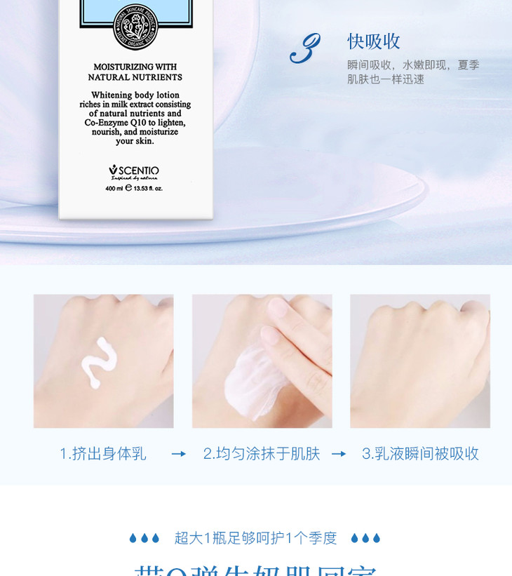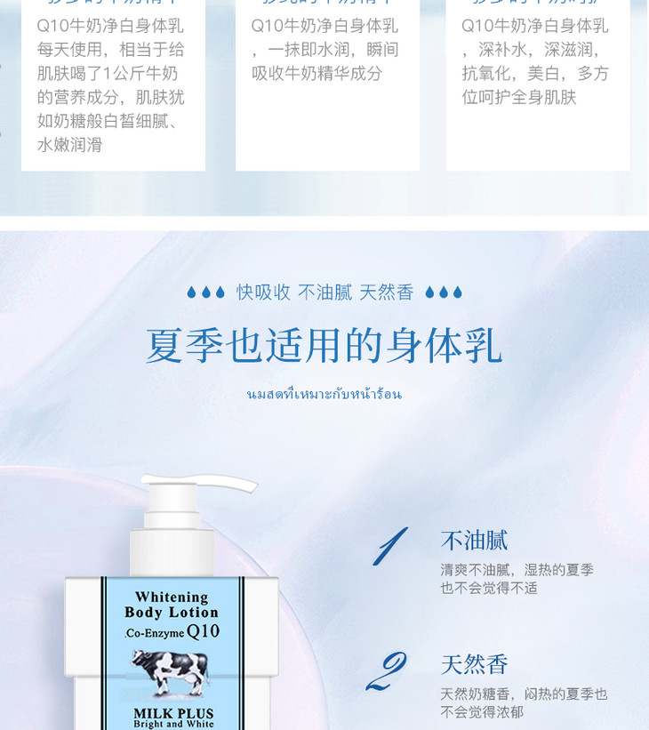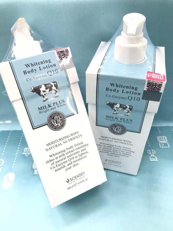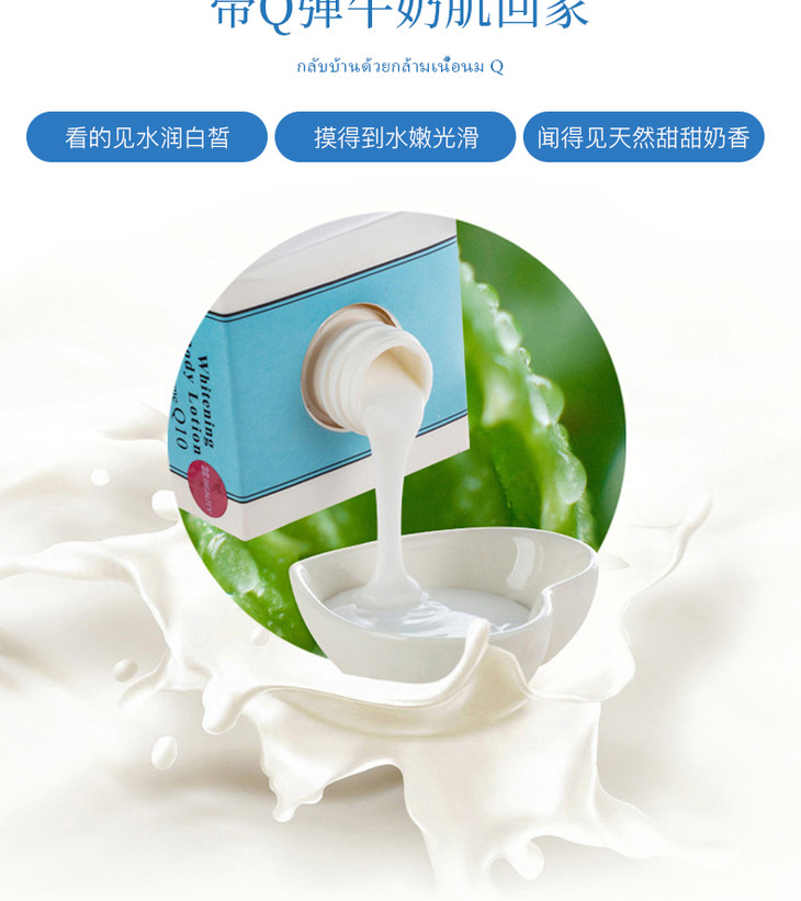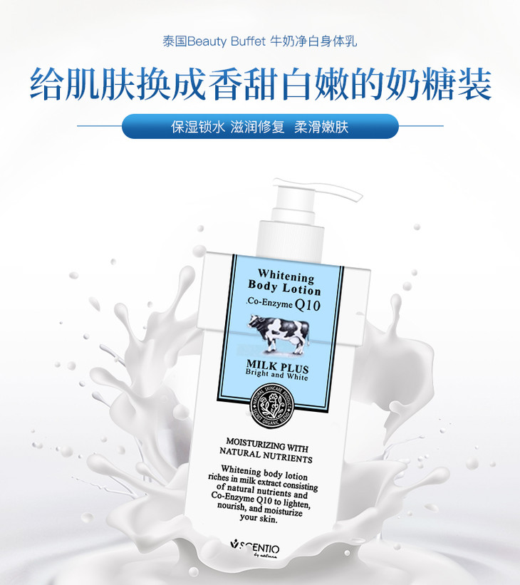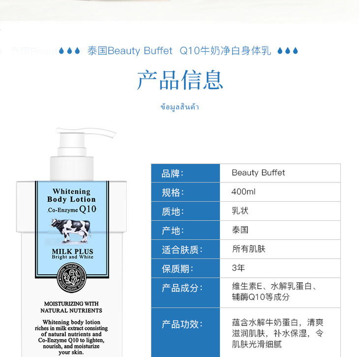 泰国Beauty Buffet牛奶Q10身体乳全身美白润肤露身体乳400ml 泰國牛奶身體乳富含美白皮膚,💎牛奶配方加入豐富純牛奶精華💦💦。有效結淨肌膚同時美白,牛奶精華深入皮膚底層,🍀從內到外補充水分。維他命C同E有助於減少皺紋👣🐚,使皮膚光滑自然。🍀真正含有牛奶成分的好東東,甜甜香香的牛奶味🌻,滋潤美白又不油膩!👈🏻美白滋潤皮膚的同時👣,補充肌膚所需水分,🌻保持肌膚動態水平衡,使肌膚恢復如絲般的柔嫩潤滑,💦持續使用更令肌膚白皙細嫩、柔滑亮麗。防止皮膚老化,💛保持年輕👍🏻