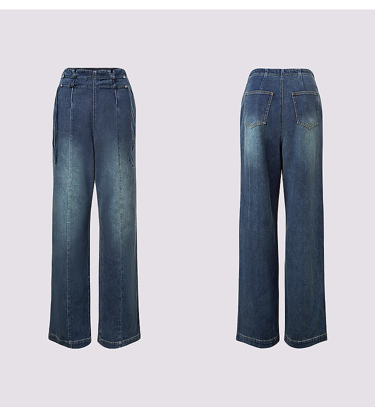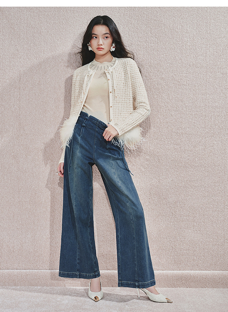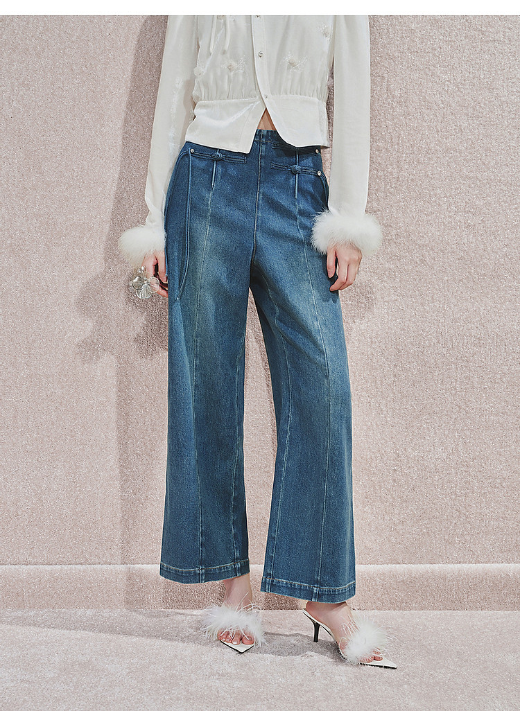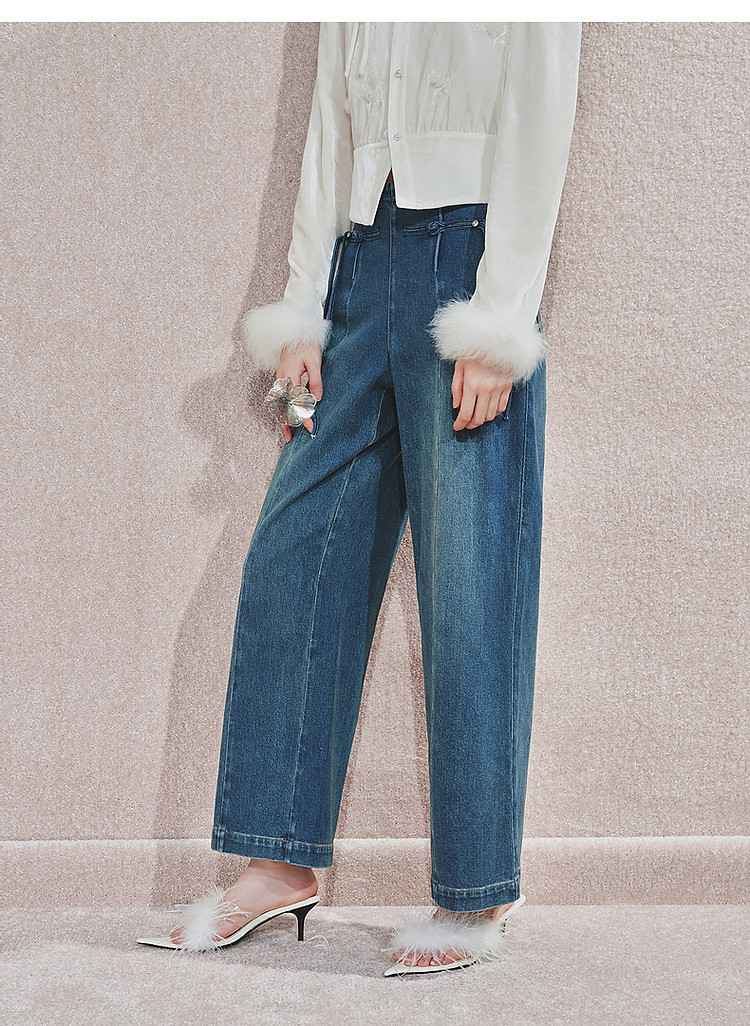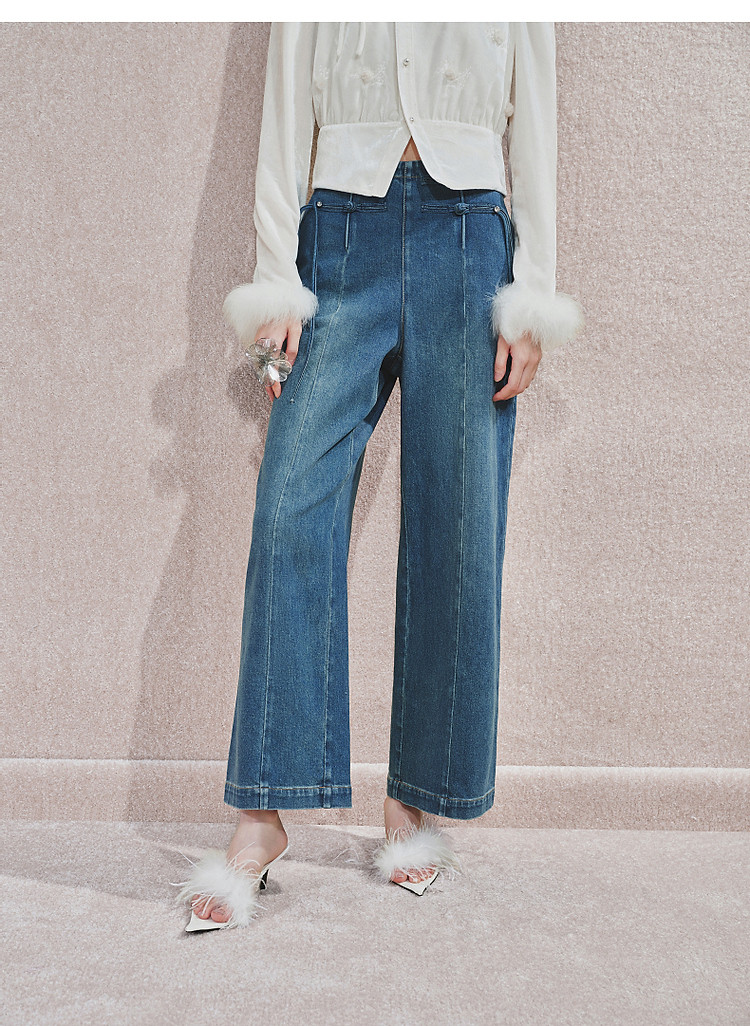 MAXRIENY精致日常感高腰显瘦复古盘扣牛仔长裤女2024秋冬新款