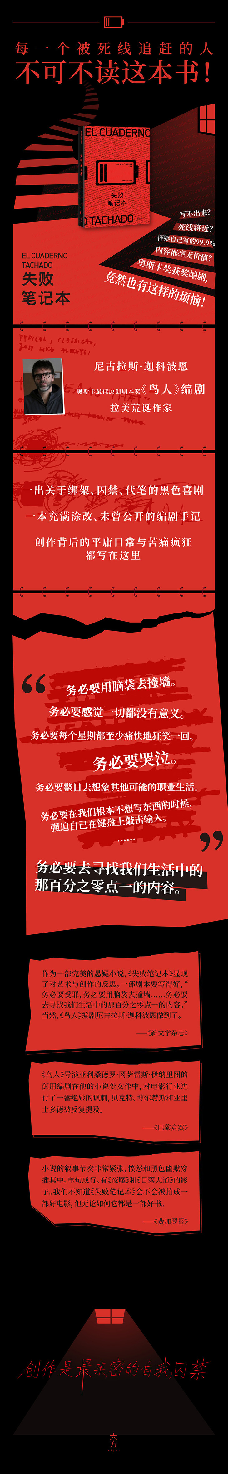 《失败笔记本》是阿根廷电影编剧尼古拉斯•迦科波恩的小说处女作。整部小说以巴勃罗偷写日记的形式,描述了主人公被绑架七年、关在地下室创作电影剧本的经历,毫不留情地直击创作背后的平庸日常与苦痛疯狂。