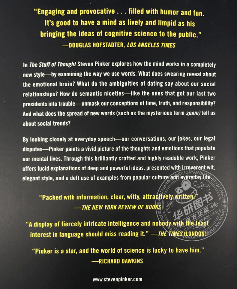 “平克在一个令人生畏的研究主题中引入了迷人和诙谐的风格。这是一本有趣又很有分量的书。任何对语言感兴趣的人,都应该读一读《思想本质》。”——罗宾·莱考夫美国加州大学伯克利分校语言学教授