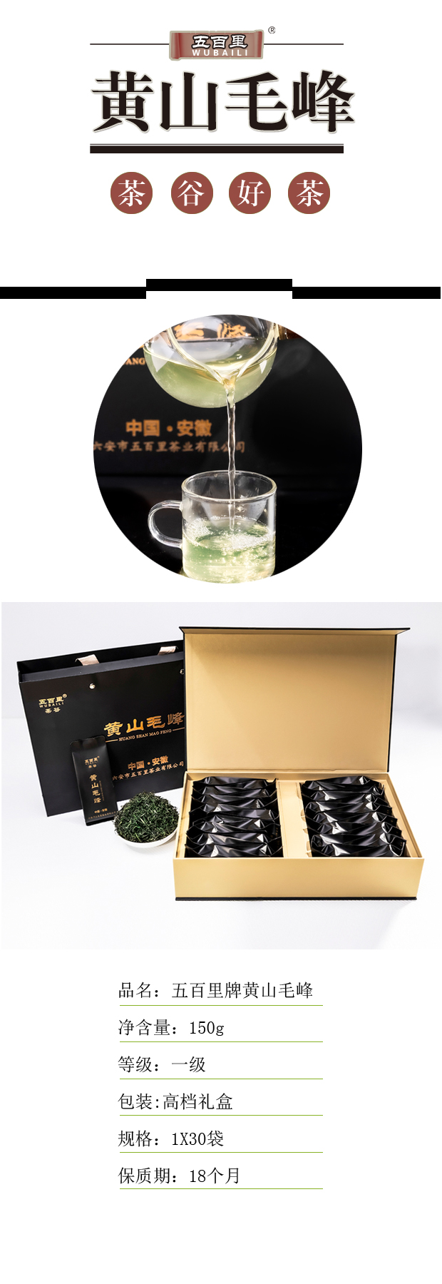 五百里 黄山毛峰 一级新茶 150克/盒