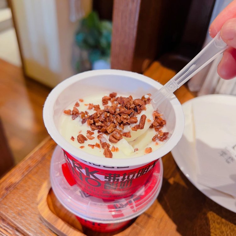 我们讨巧的给碧根果仁粒起名叫“碧粒碧粒”,洒下粒粒碧根果,焦香微脆的口感,让整杯酸奶的口感层次又丰富了好几个度。