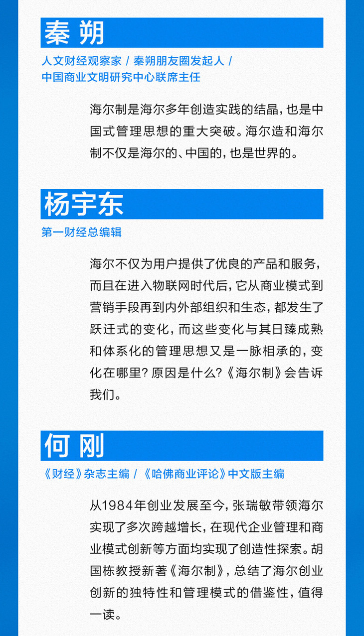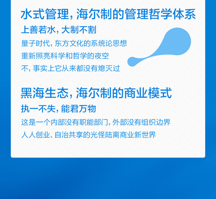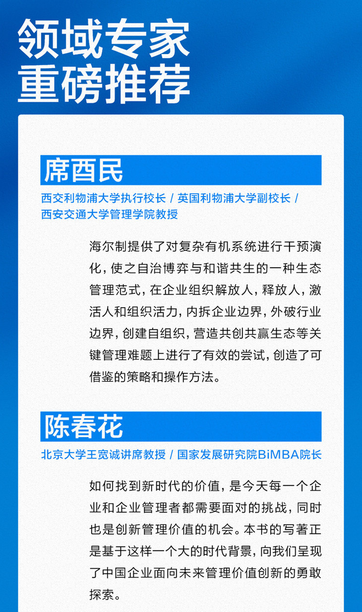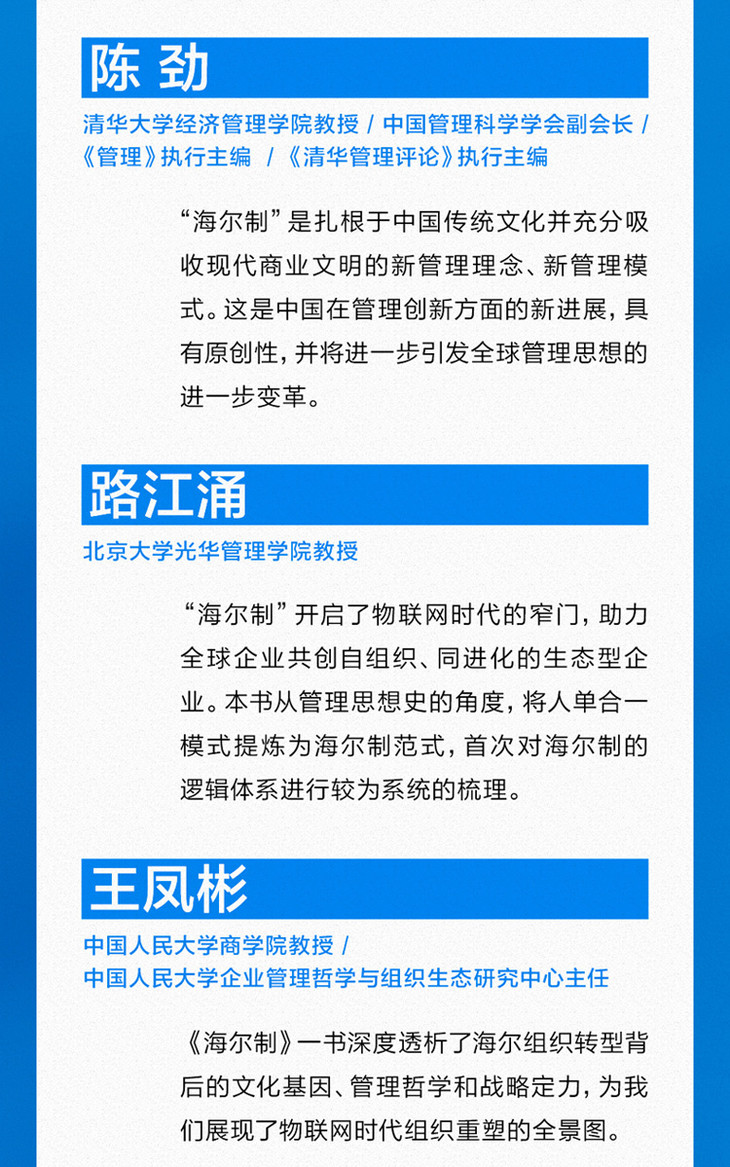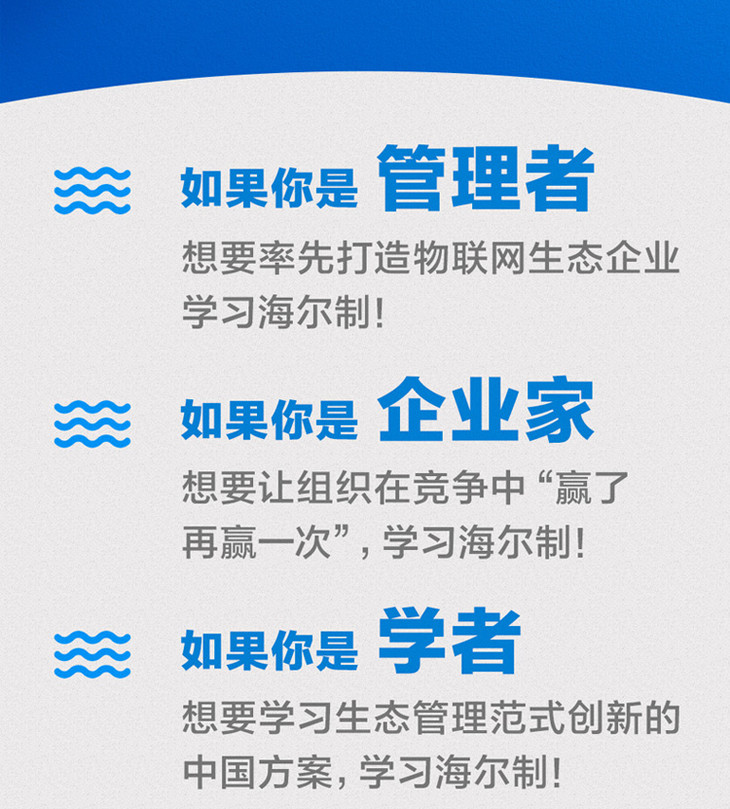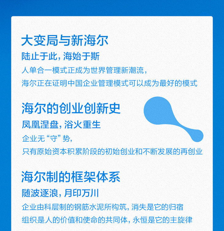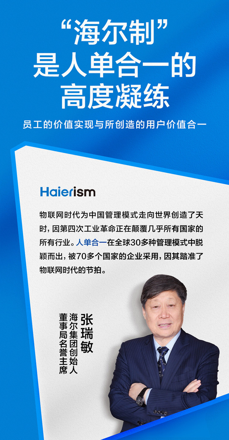 ● 人单合一模式正成为世界管理新潮流,我们正在证明中国企业管理模式可以成为很好的模式。 如果你是学者, 想要学习生态管理范式创新的中国方案,学习海尔制! 海尔几乎浓缩了至今人类企业组织变革的历程,在某种程度上也是中国企业百年演变的历史缩影。而海尔制贡献了一个“道”与“术”相结合的体系,整合战略、哲学、组织、激励四大子系统,同时包含创新创业的文化基因、赋能平台与财务驱动工具等,由此建构形成海尔制的理论体系,完整地输出海尔的管理模式,系统构建海尔制的哲学思想、管理系统以及工具方法。