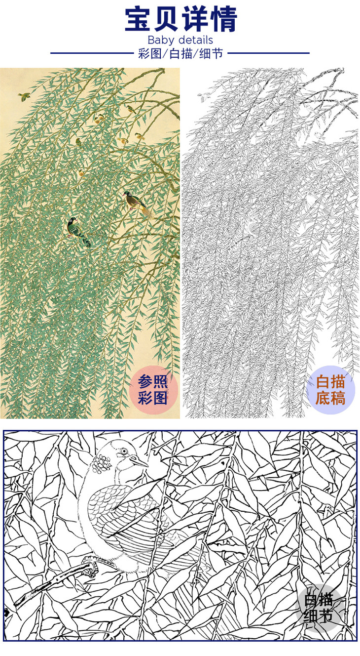 竖幅工笔花鸟白描底稿-周彦生《二月春风》-多种白描尺寸可选-QN06