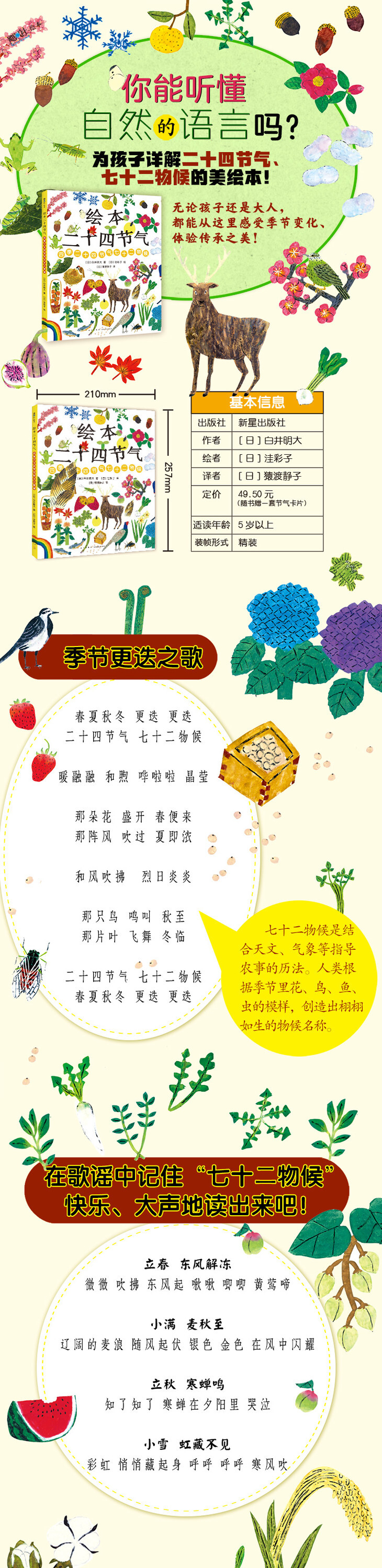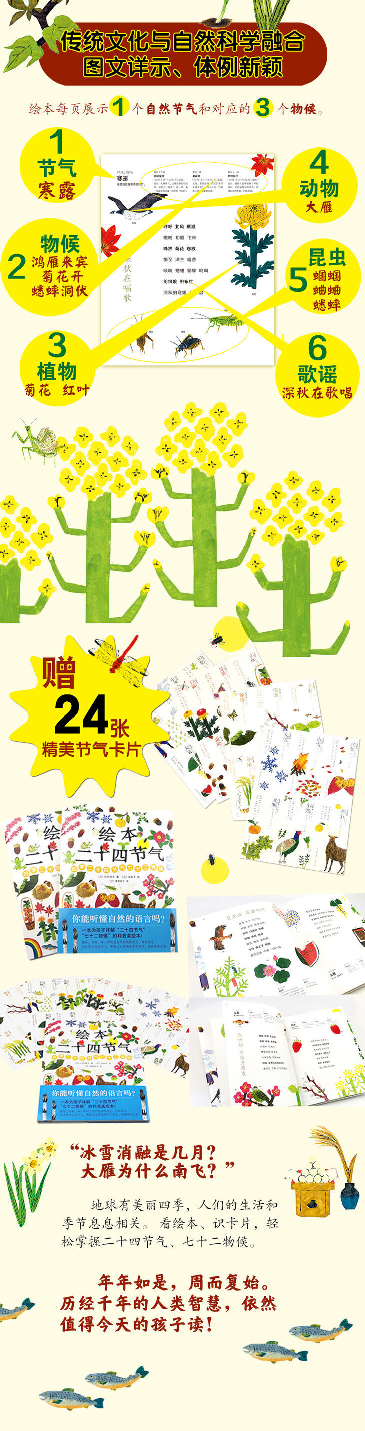 随书附赠24张精美的节气卡片,回答生活中孩子对自然节气、物候的提问,富有知识、趣味性。