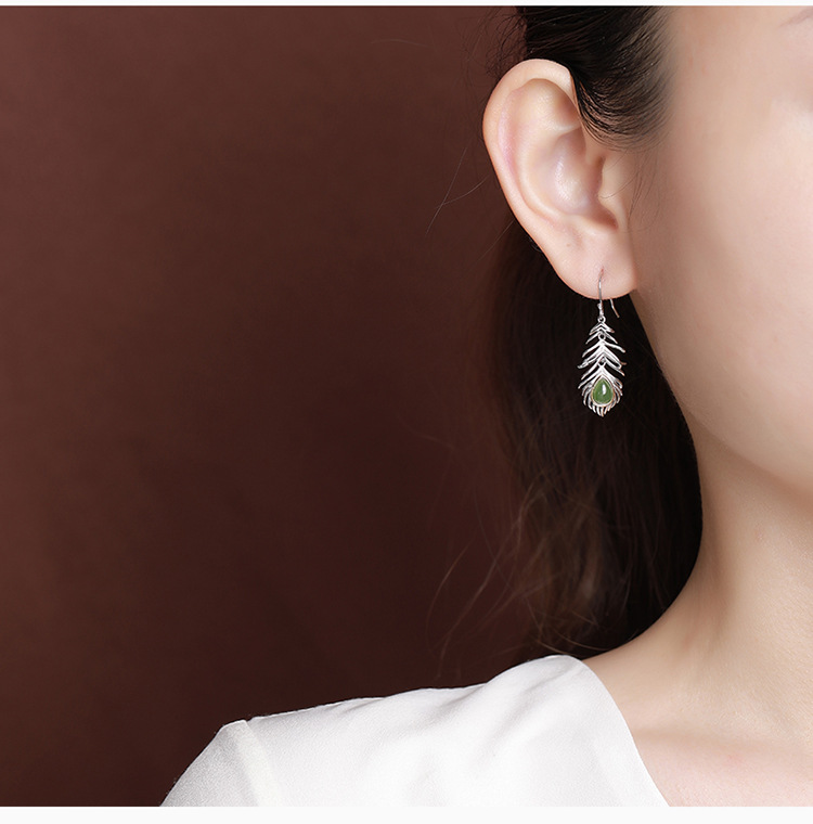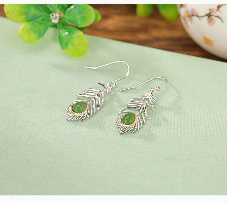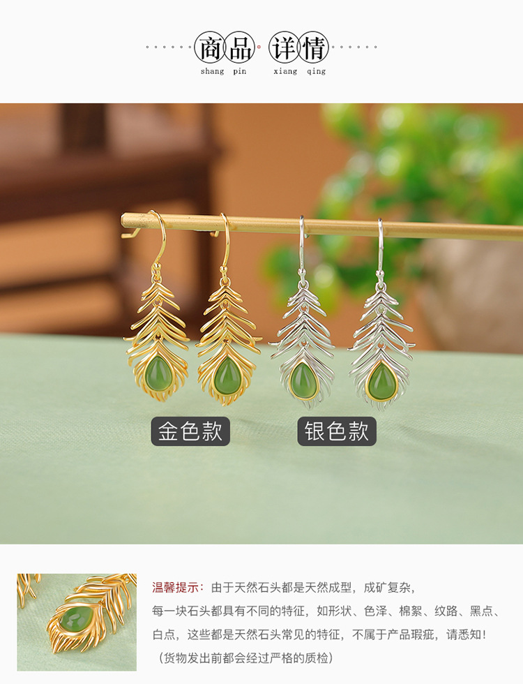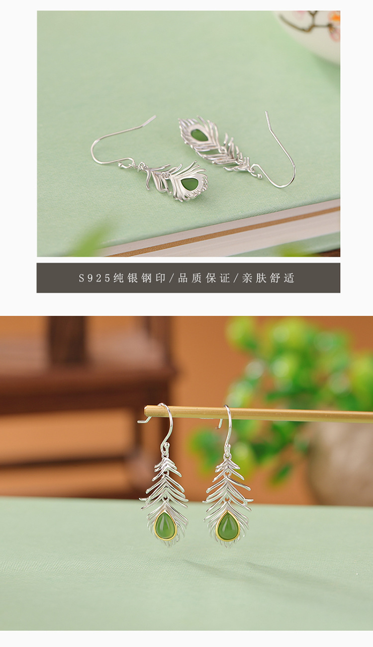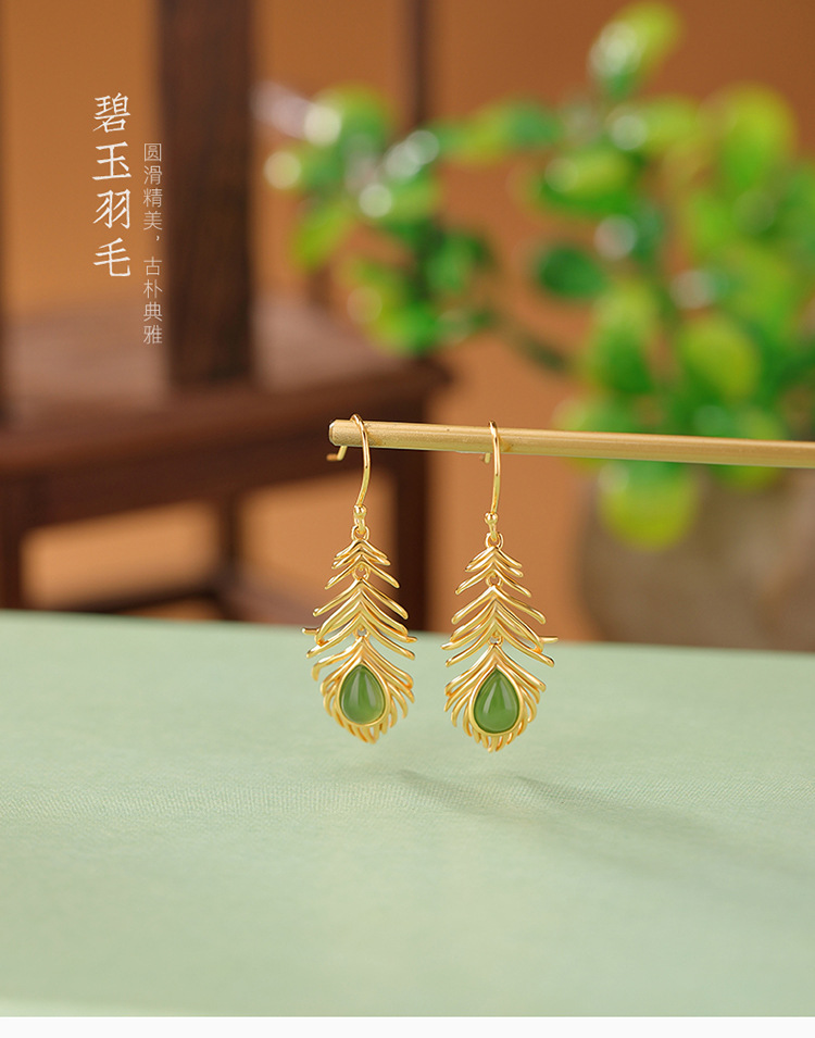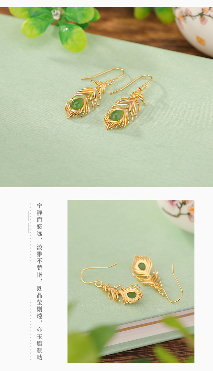 S925纯银镀金和田玉碧玉羽毛水滴耳坠CW
