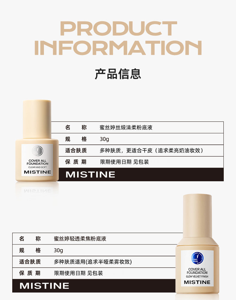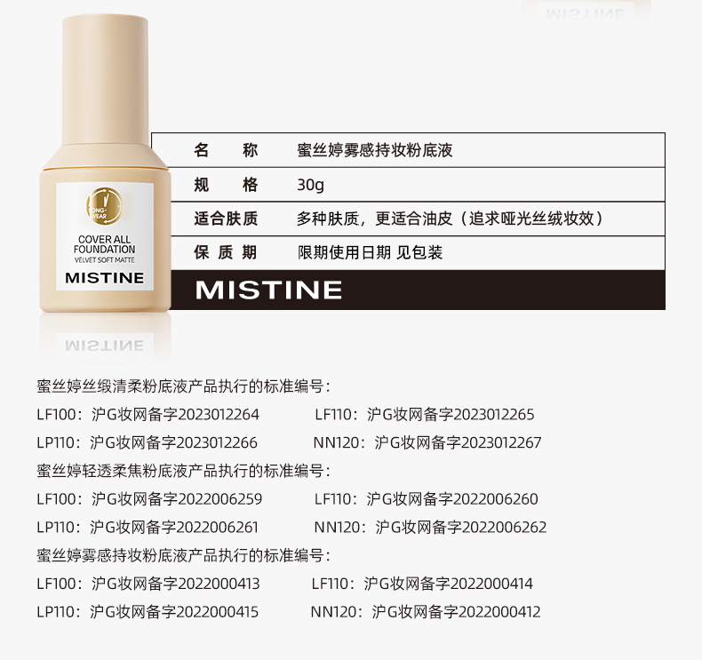 泰国蜜丝婷Mistine金盾雾感持妆粉底液LF110(白皙中调)30g(新)