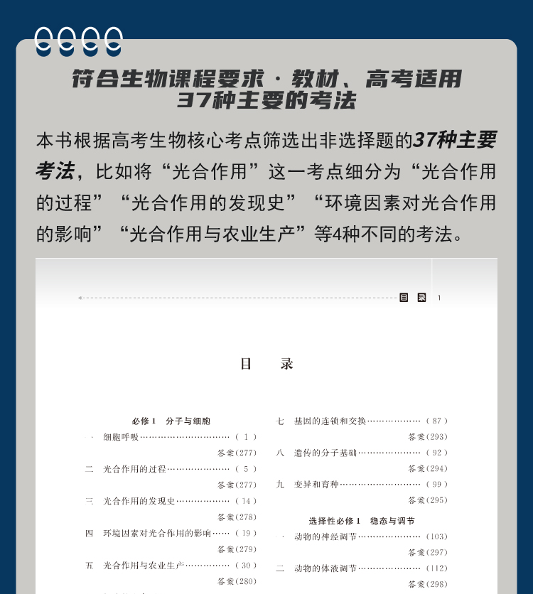 本书为作者20多年教学经验总结而得。本书根据高考生物非选择题的考点筛选出26种主要考法,比如将“光合作用”这一考点细分为“光合作用的过程”、“光合作用的发现史”、“环境因素对光合作用的影响”、“光合作用与农业生产”这4种不同的考法。通过精选历年高考真题、各地模拟题共计400道左右,按照这26种考法进行非常详细地分类汇编。聚焦学生的学习方向,集中学生的学习发力点,为学生提供精准的狙击点,从而达到事半功倍的学习效果。