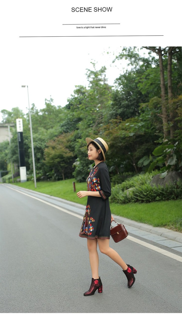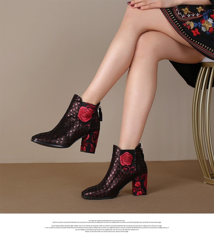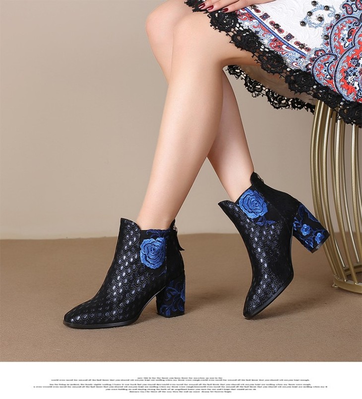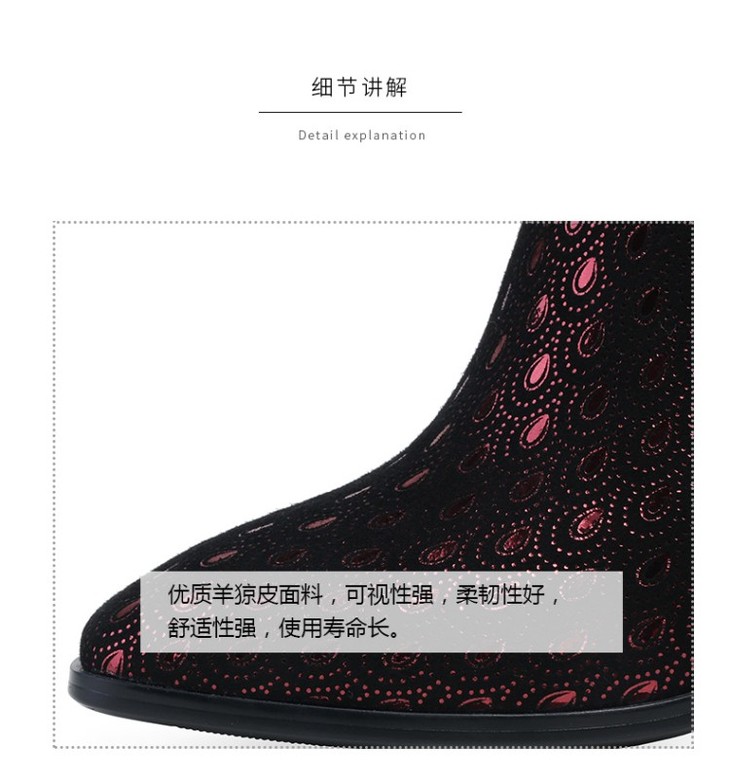 TMN-L009-2 秋冬季新款时尚孔雀纹印花羊皮女单鞋刺绣网面休闲女短靴