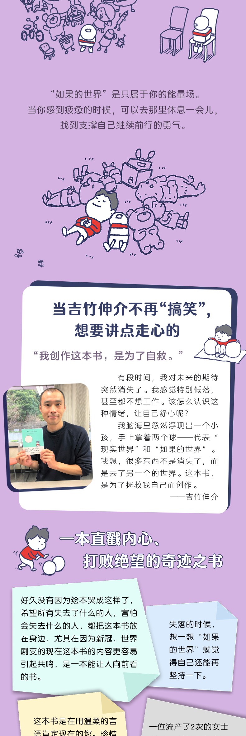 ★ 有段时间,我对未来的期待突然消失了。我感觉特别低落,甚zhi都不想工作。该怎么认识这种情绪,让自己舒心呢?我脑海里忽然浮现出一个小孩,手上拿着两个球——代表“现实世界”和“如果的世界”。我想,很多东西不是消失了,而是去了另一个的世界。这本书,是为了拯救我自己而创作。——吉竹伸介