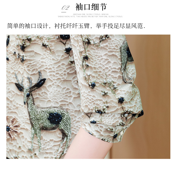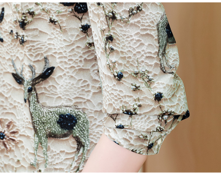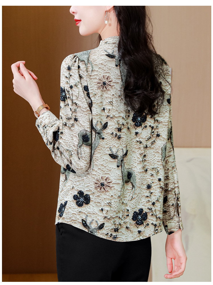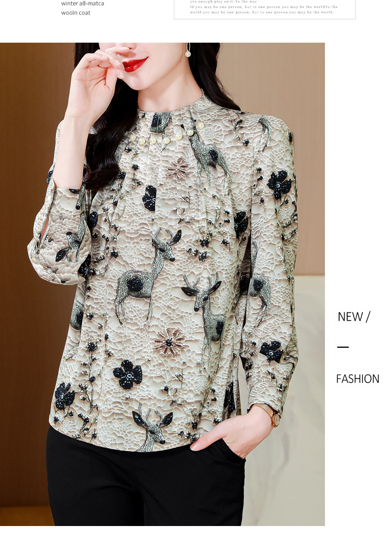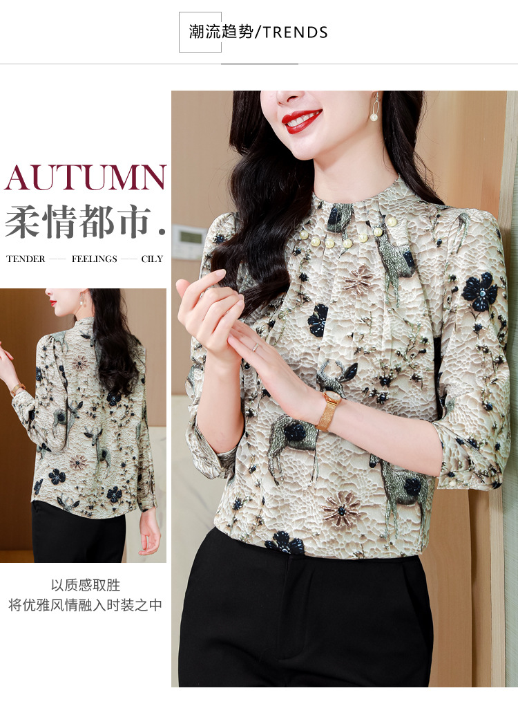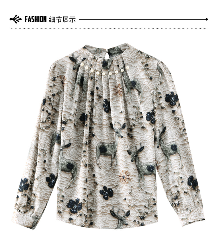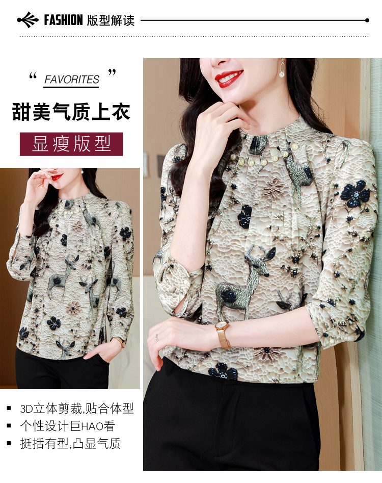KQL 369H9980立领钉珠印花长袖雪纺衬衫