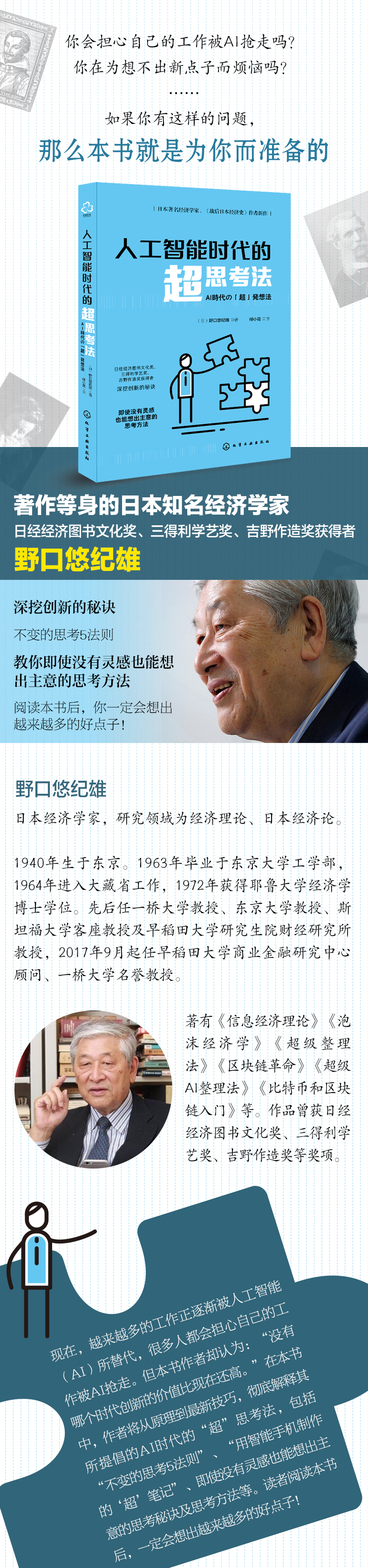 在AI时代,各种各样的工作正逐渐被“AI”所替代,很多人都会担心自己的工作被抢走。日本经济学家野口悠纪雄认为,没有哪个时代的创意价值比现在还高;从某种意义上来说,这也是一个重大的机遇。实际上,很多人都对如何产生新的想法这一问题感兴趣。产生想法并不是一件简单的事情,有些人提出了各种各样的思考方法。但思考并非按照定型的程序来进行。我们却可以发现,在如何思考上是有一定规律可循的。本书首先揭示了关于思考的一些规律,并基于这些规律,提出了如何进行思考的具体意见。
