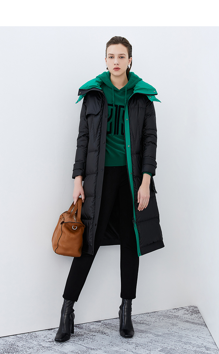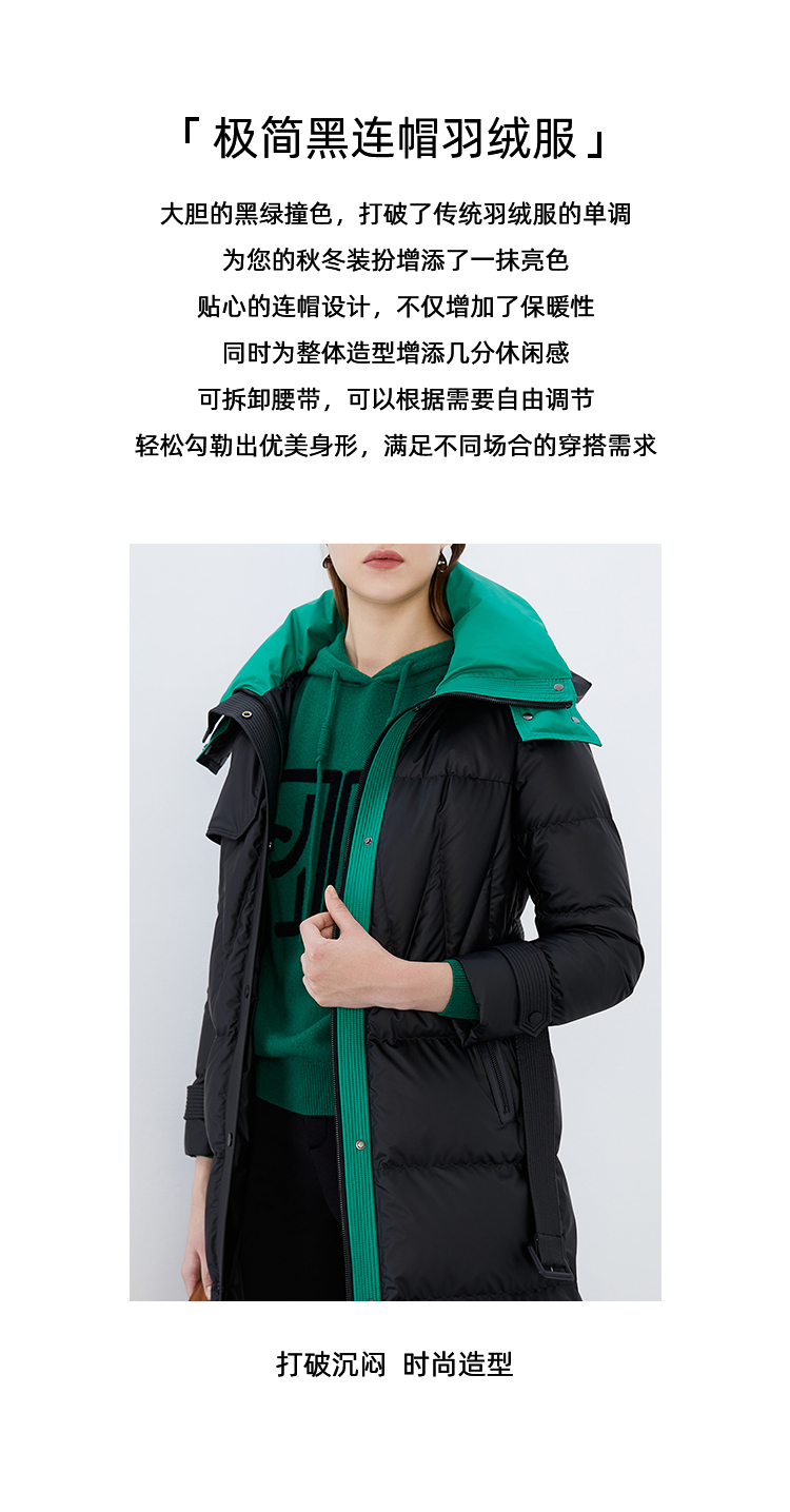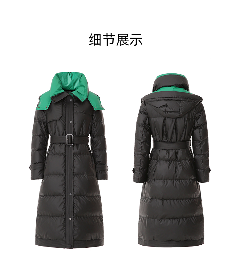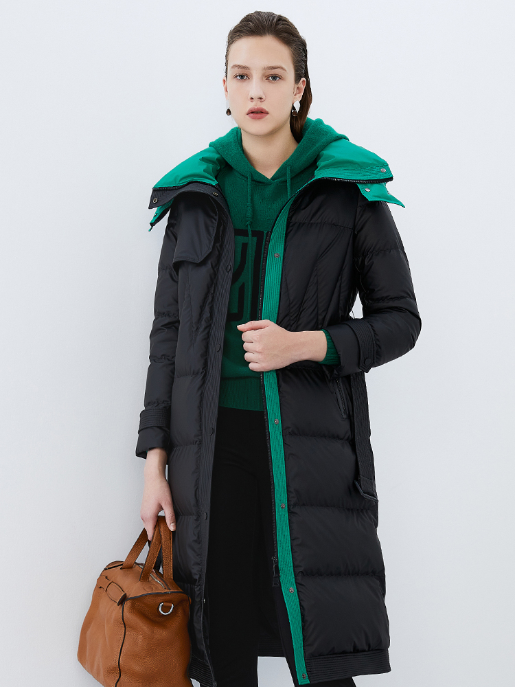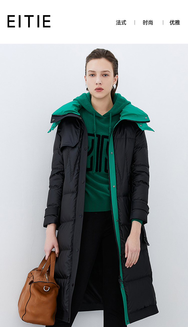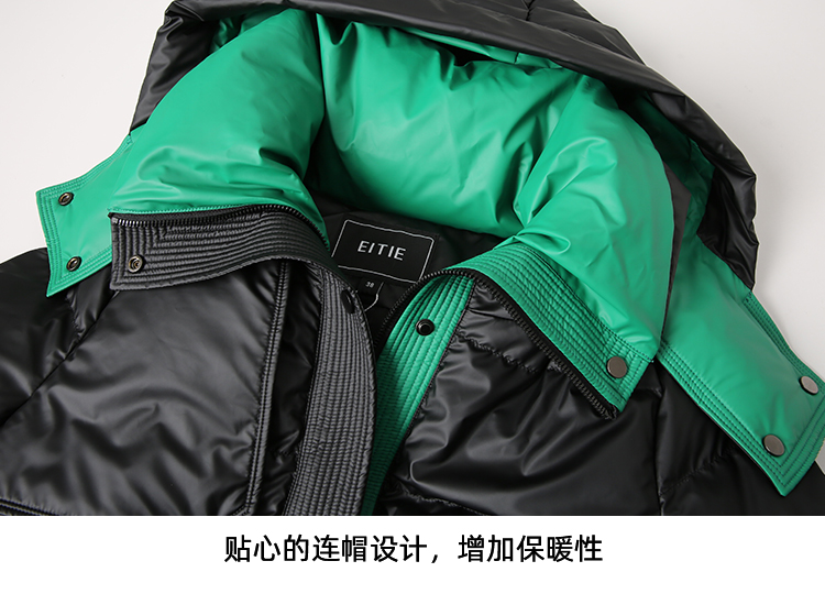 EITIE爱特爱冬季新款撞色收腰显瘦连帽加厚长款羽绒服女7611316