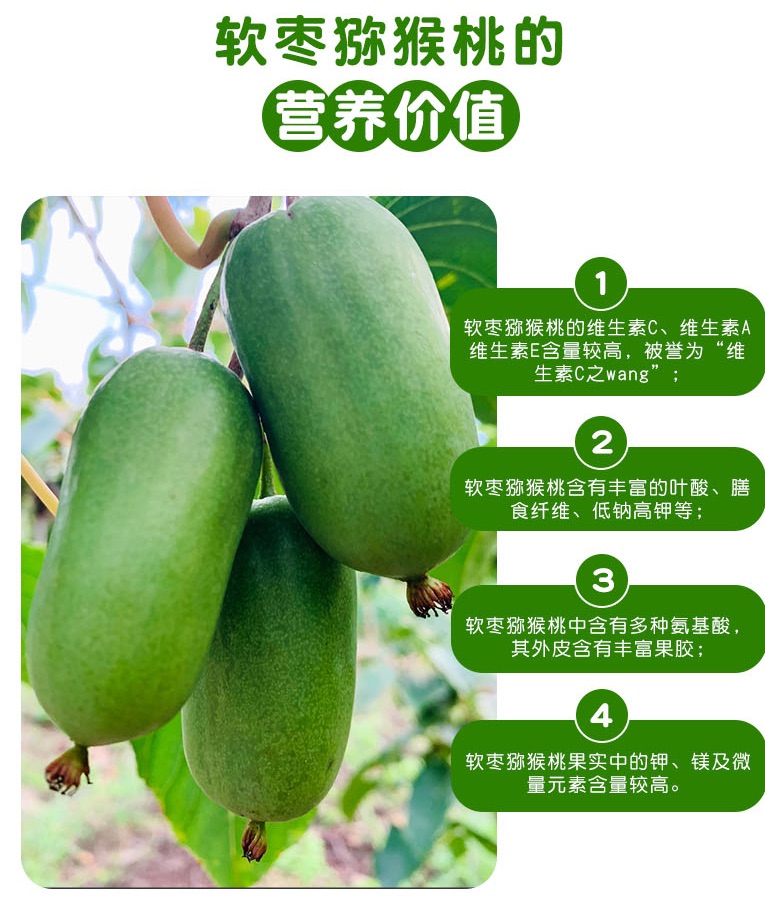 软枣猕猴桃的维生素C维生素A 维生素E含量较高,被誉为维C之王。有丰富的叶酸,膳食纤维,多种氨基酸,其外皮含有丰富果胶,果实中的钾,镁及微量元素含量较高。养生价值极高,老少皆宜