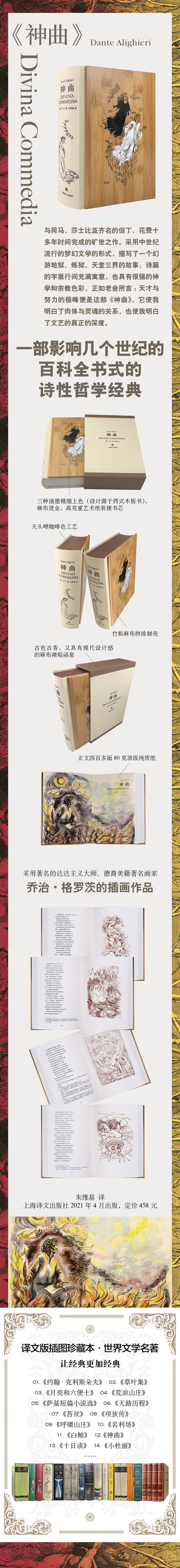 朱维基先生的《神曲》译本是公认的经典诗体译本,之前在我社已出过多个版本,备受读者好评,现收入“译文版插图珍藏本世界文学名著”丛书出新版。法国十九世纪著名版画家多雷为《神曲》创作的插图流传最广,之前各版我们采用的也是多雷的插图,但我们此次“插图珍藏本”特意采用著名的达达主义大师、德裔美籍著名画家乔治•格罗茨(George Grosz,1893—1959)的插画作品。格罗茨应邀特为美国现代文库一九三二年版《神曲》创作了三十余幅插图,我们的“插图珍藏本”全部收入,专色精印,以期为读者提供一个理解和欣赏古典文学名著的新鲜的现代主义视角。本书创造性地采用竹板与天然麻布制作书壳,全书双色印刷,文图辉映,珠联璧合,极富赏鉴和收藏价值。
