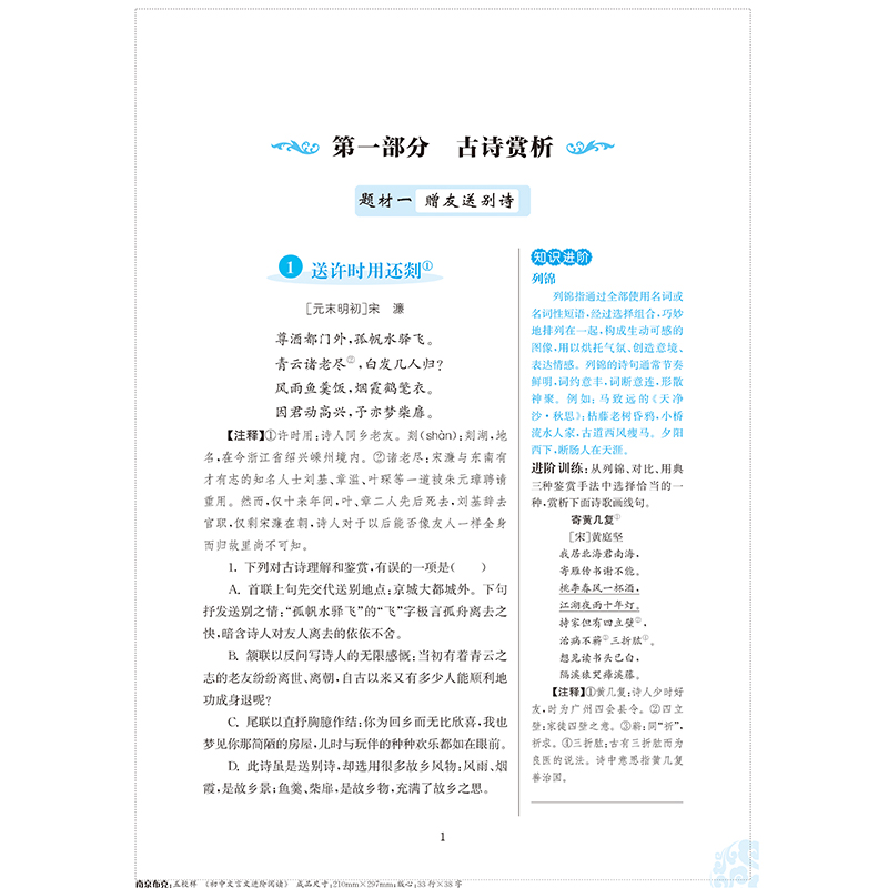 课内外比较阅读:每个题材都安排了“比较阅读”,涵盖每学年的课内古诗文;古诗文联读部分,对教材中涉及的重要人物、话题进行专题训练。