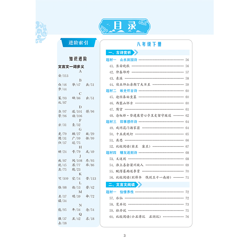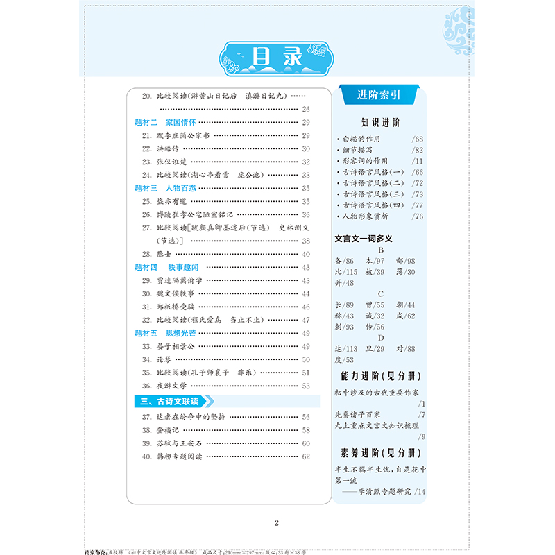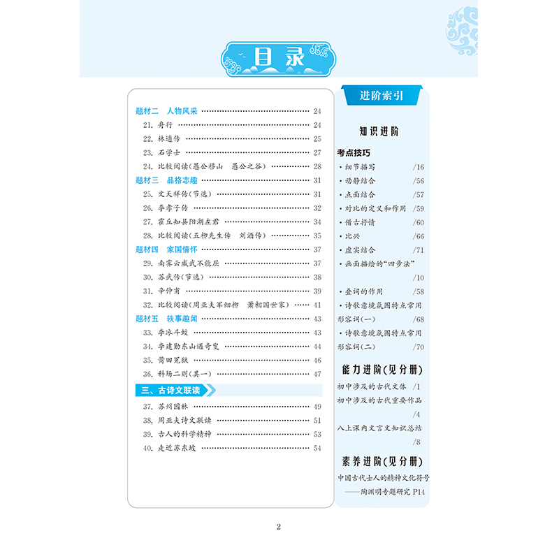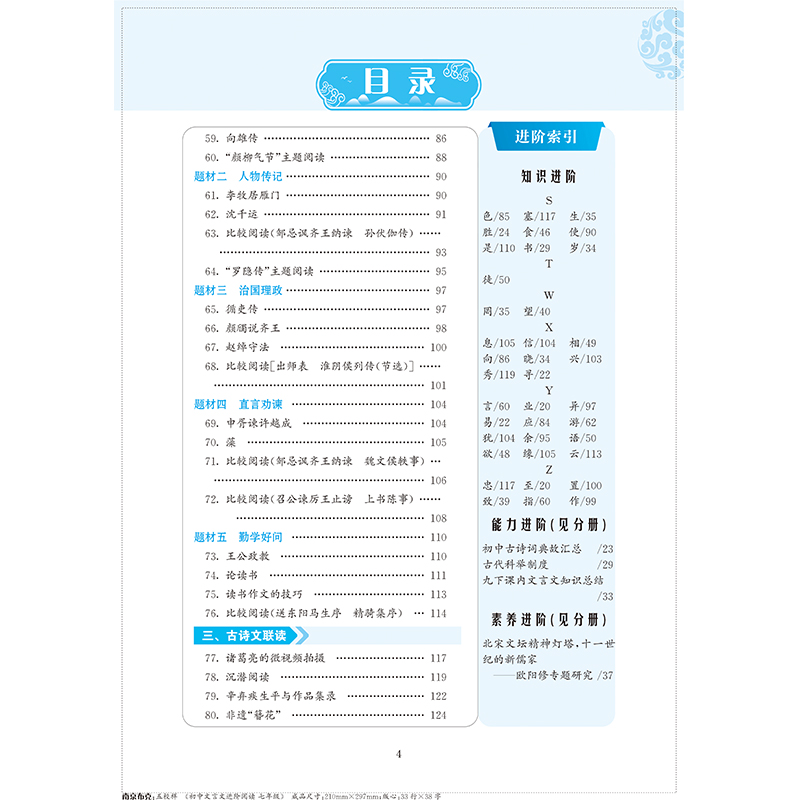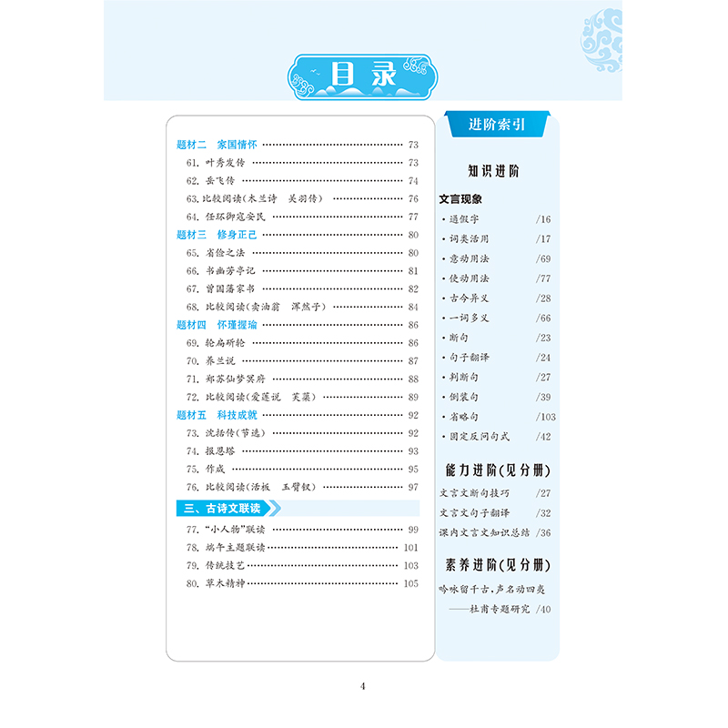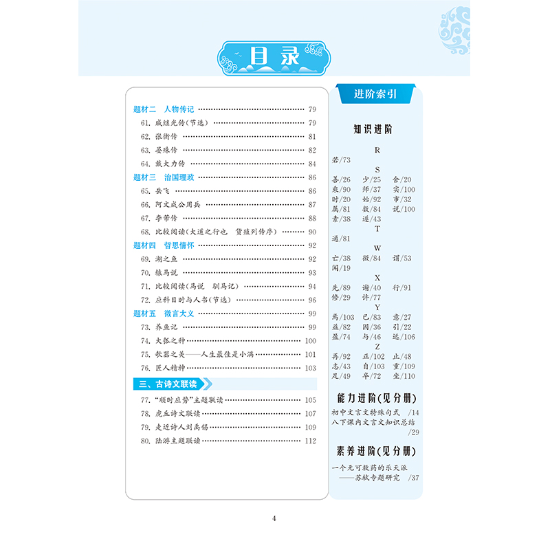 文言文进阶阅读:80篇不同题材进阶练习,旁批文言文高频考点,并在目录中设置了“知识进阶”索引,方便快速检索。
