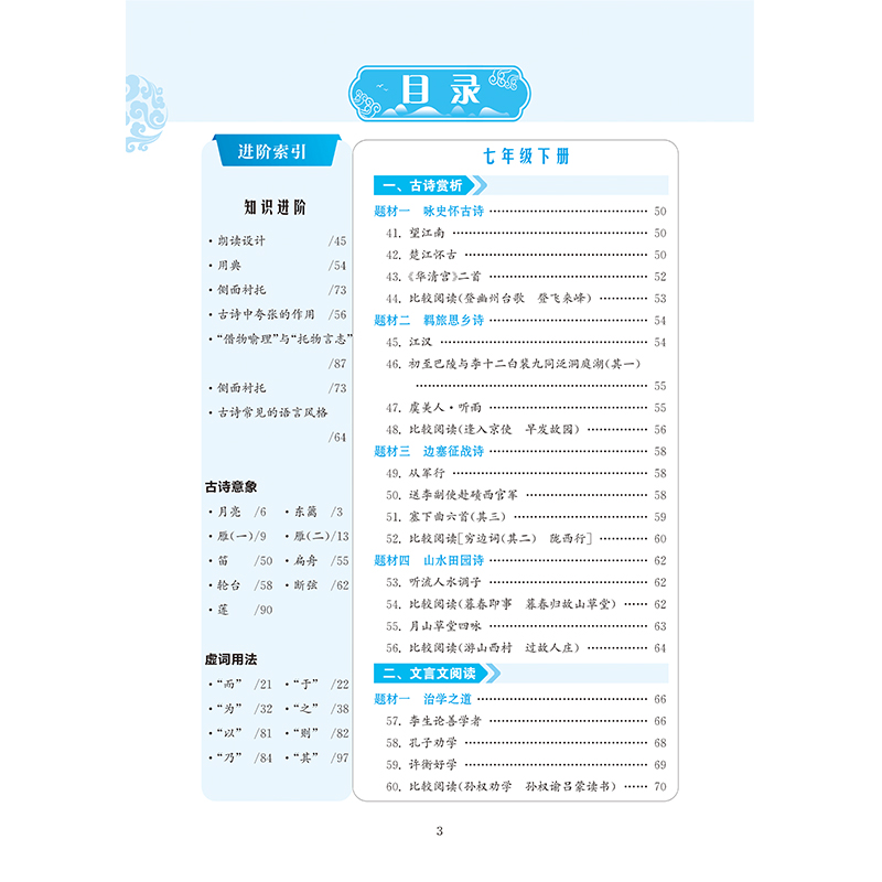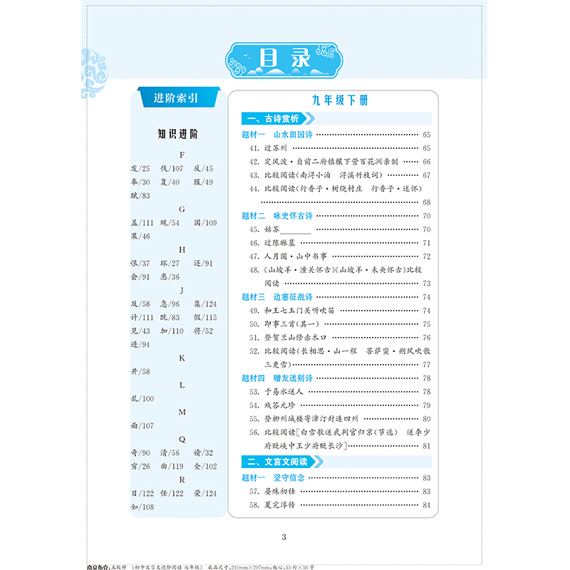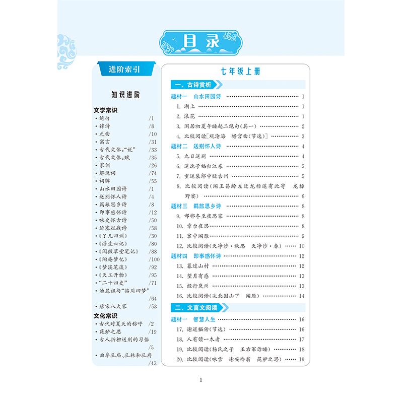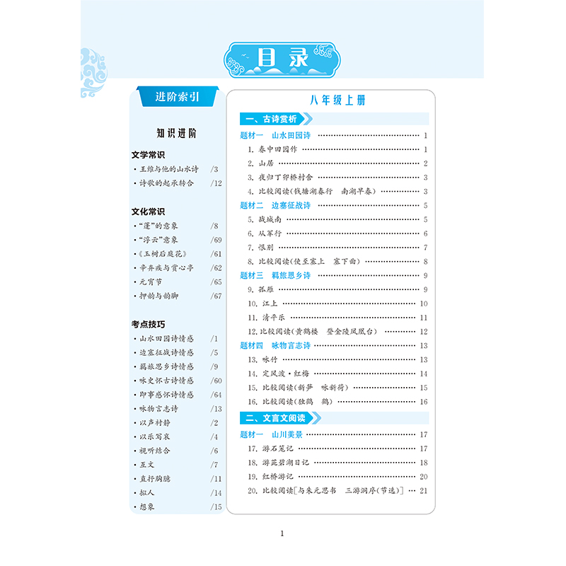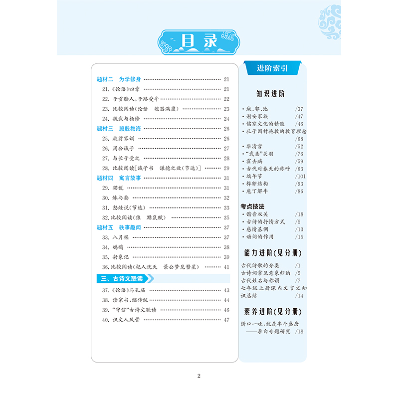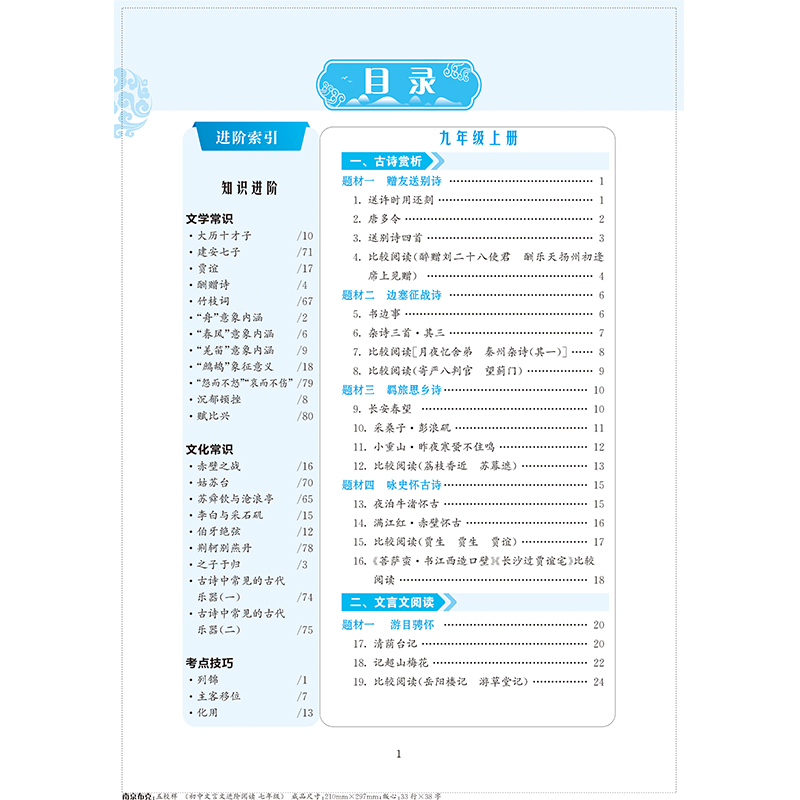 文言文进阶阅读:80篇不同题材进阶练习,旁批文言文高频考点,并在目录中设置了“知识进阶”索引,方便快速检索。