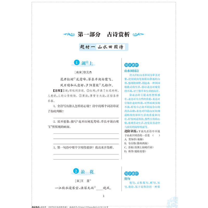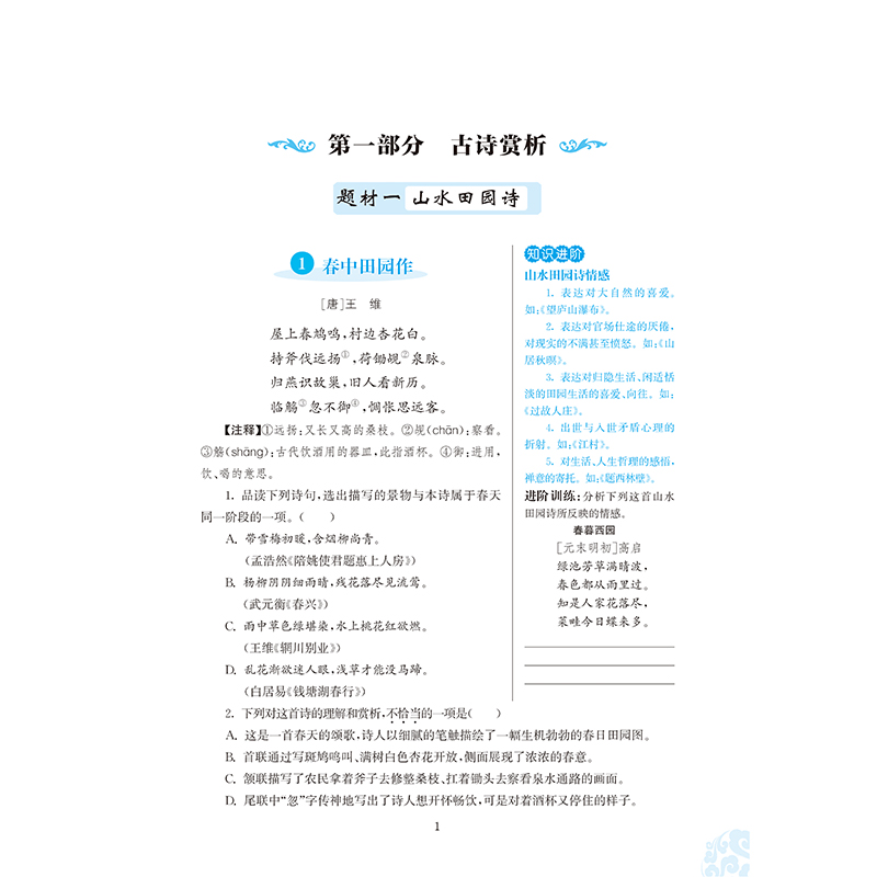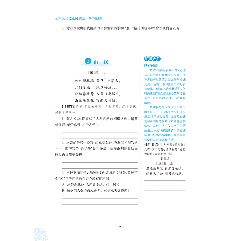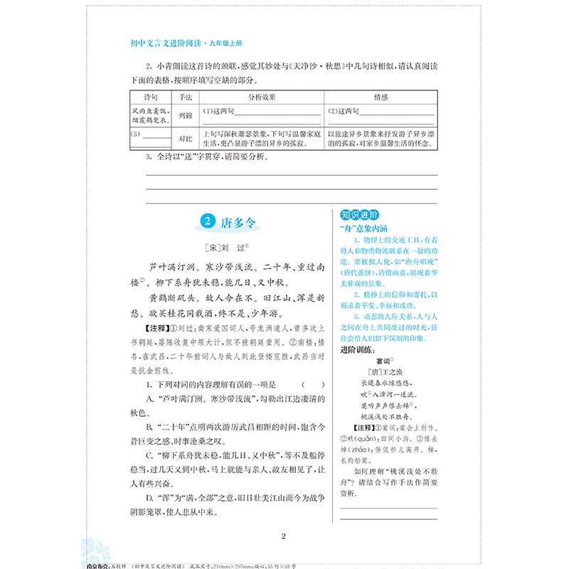 1.进阶一:文学常识的进阶。在正文分册中,在阅读材料旁补充文学常识、文化常识等。