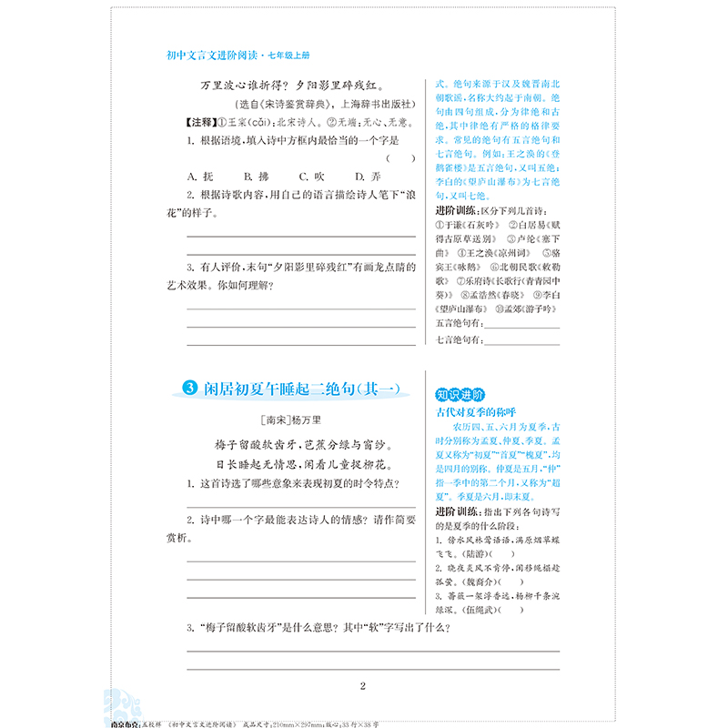 《初中文言文进阶阅读》精心筛选各年级优质前沿真题80篇。以旁批形式补充文化常识、文言现象等“知识进阶”,在阅读时,孩子能同步知晓作家流派、历史背景。学生还能通过进阶手册中“素养进阶”部分的作家专题研究,深入探究作家生平和作品内涵。此外,进阶手册中的“能力进阶”部分还总结了每学期的文言文重要考点,备考一本搞定。