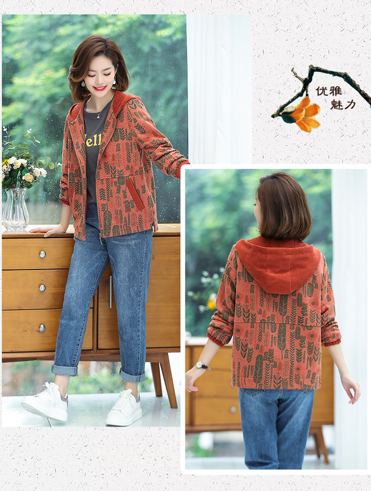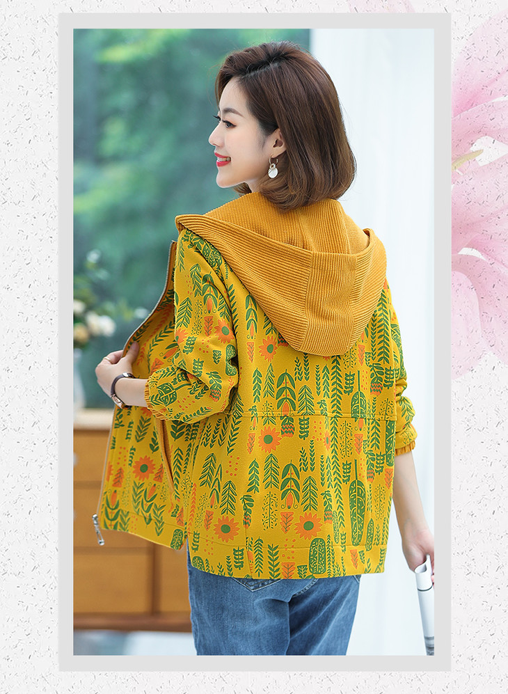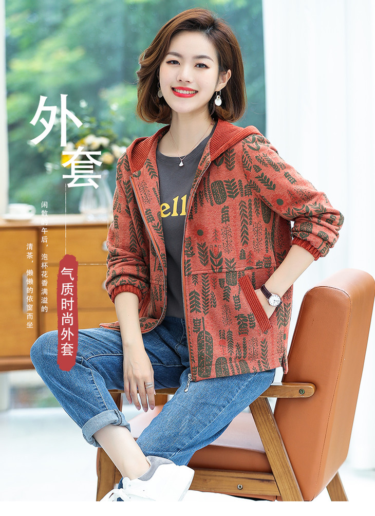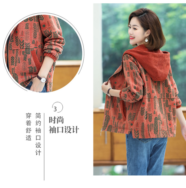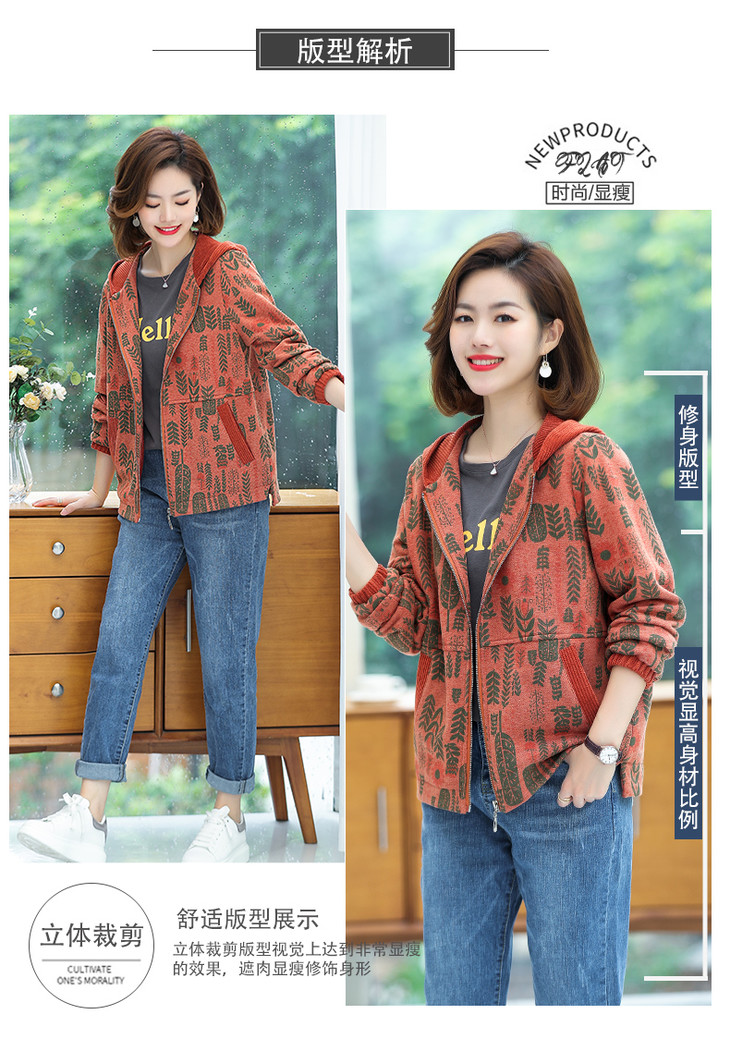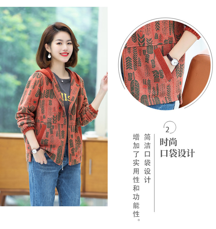 JS22A花色外套女春秋新款大码宽松休闲针织拼接连帽中老年洋气卫衣