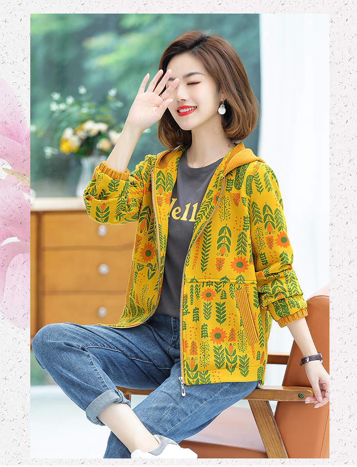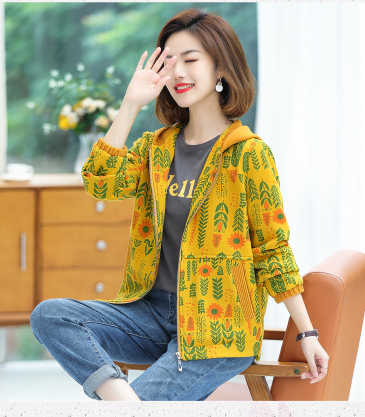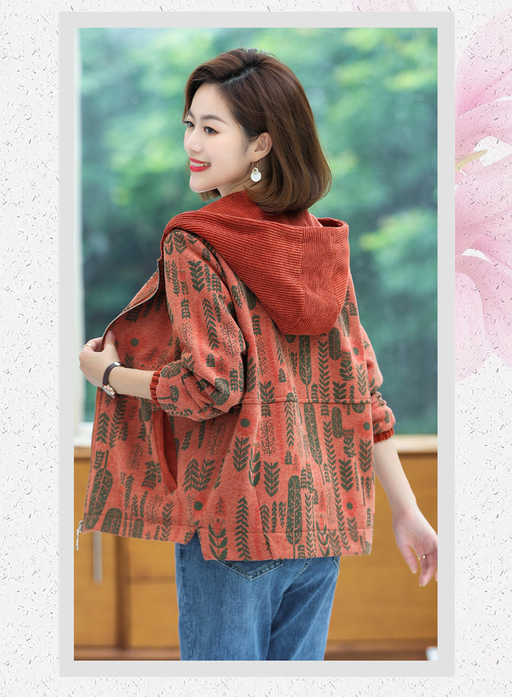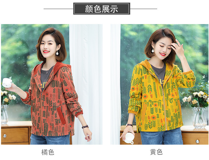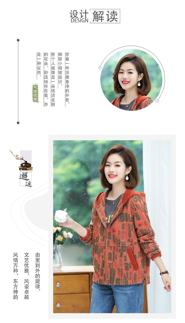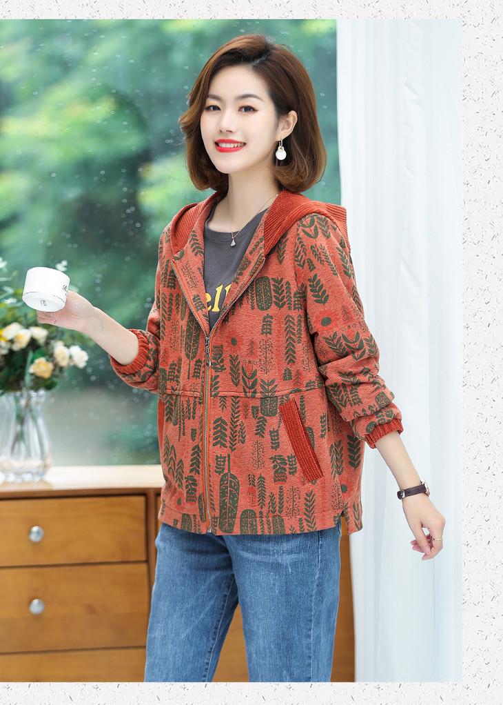 JS22A花色外套女春秋新款大码宽松休闲针织拼接连帽中老年洋气卫衣