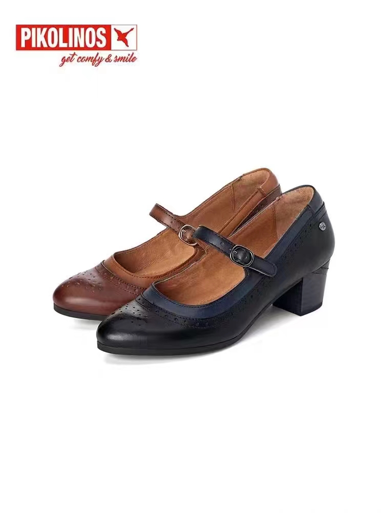 派高雁秋季牛皮一字式扣带浅口粗跟玛丽珍