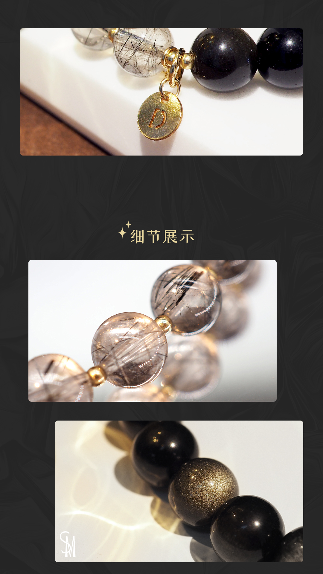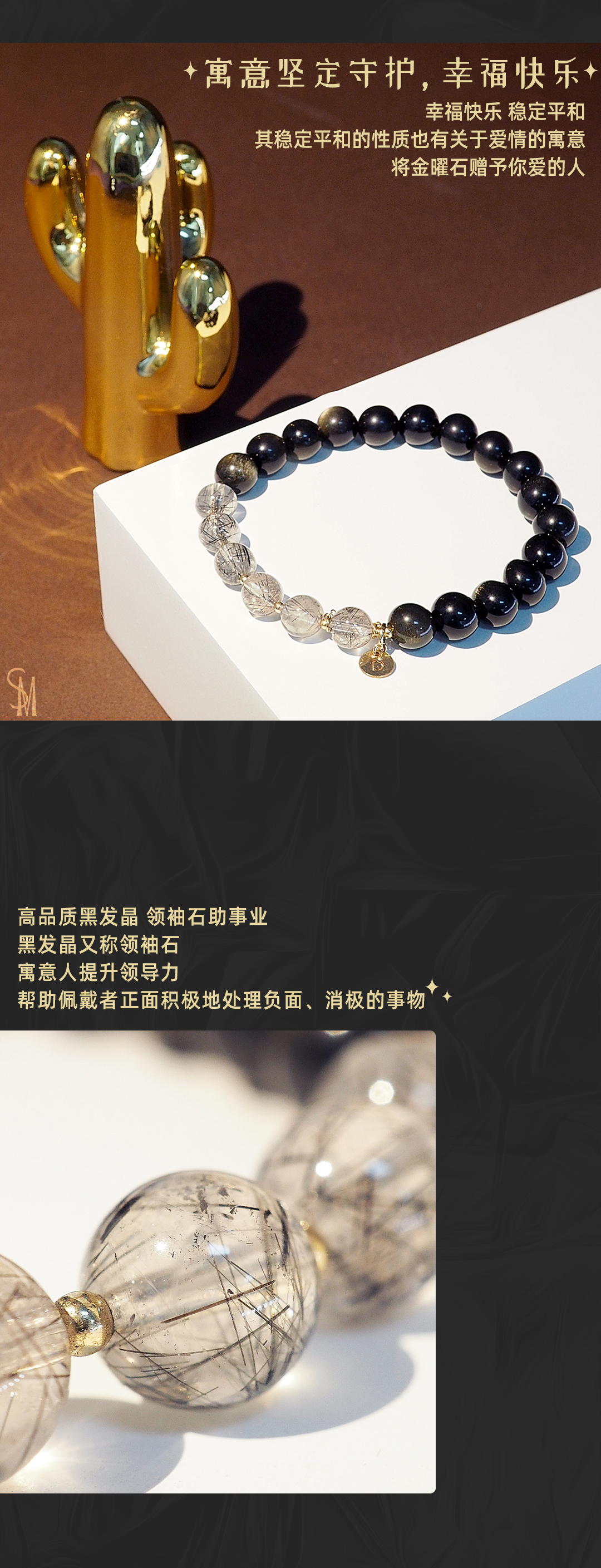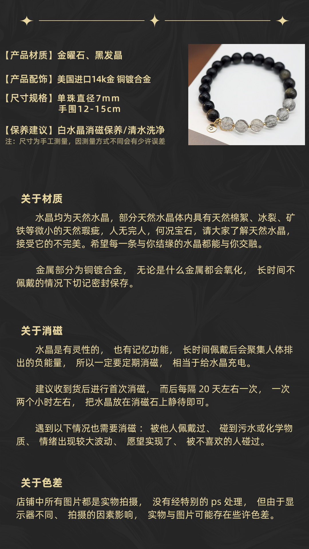 3、本手链为单颗珠体7mm的天然黑发晶和金曜石串成,金属部分为铜镀金,由于尺寸为手工量度,可能略有误差。