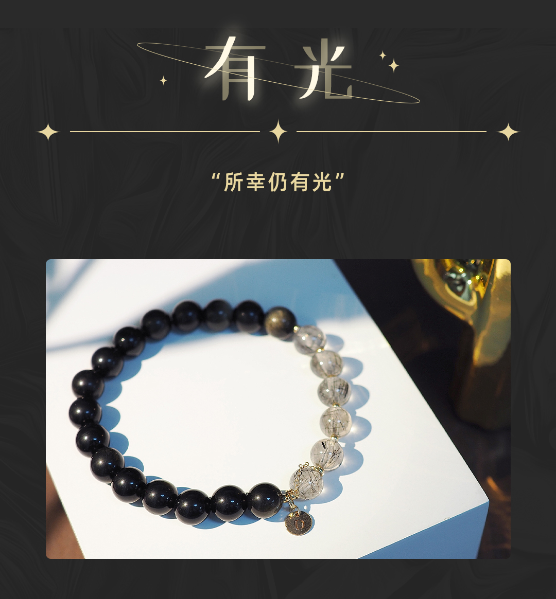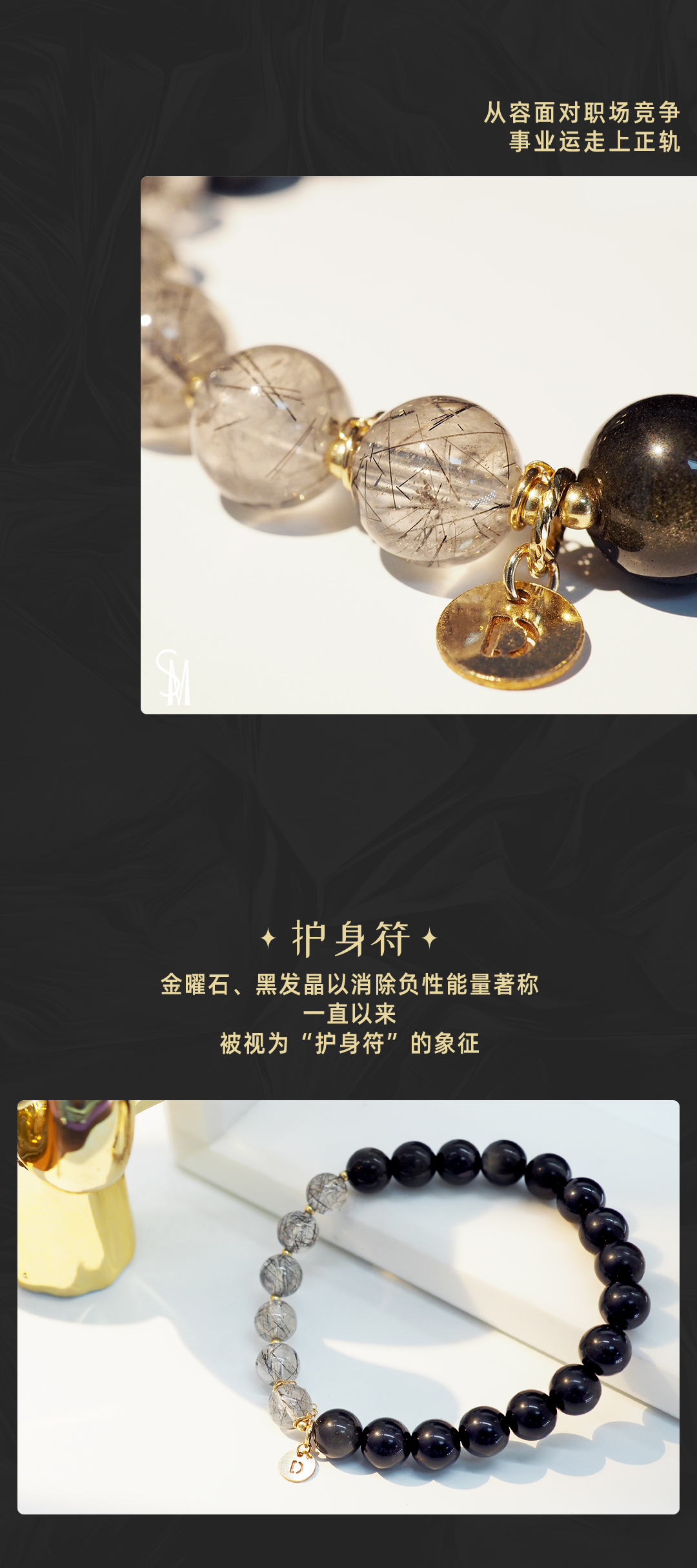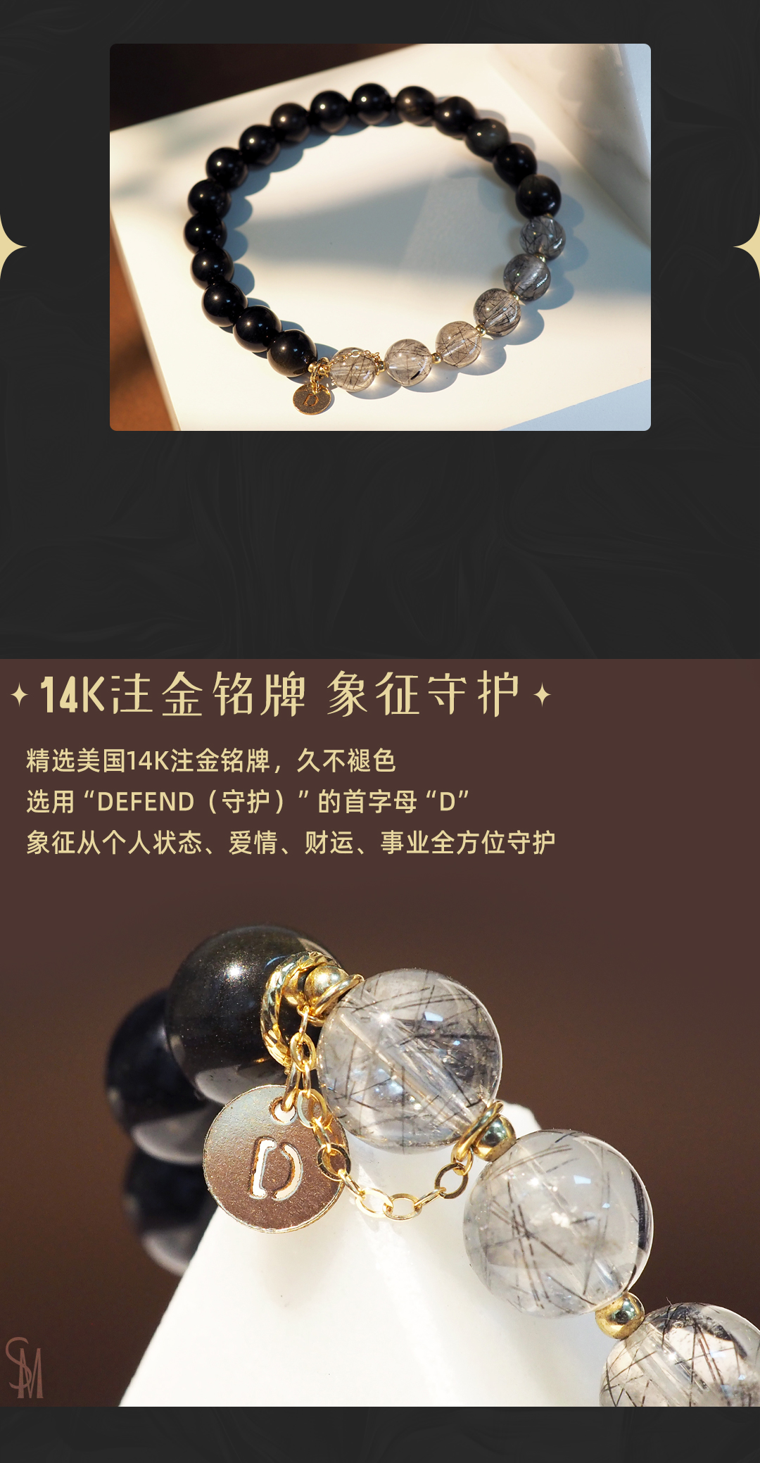 3、本手链为单颗珠体7mm的天然黑发晶和金曜石串成,金属部分为铜镀金,由于尺寸为手工量度,可能略有误差。