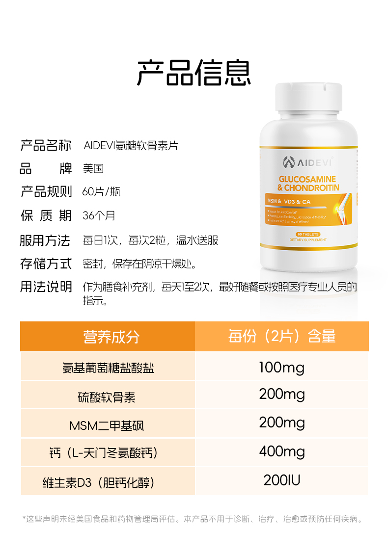 美国 Aidevi艾德维 骨骼健康 氨糖软骨素复合胶囊
