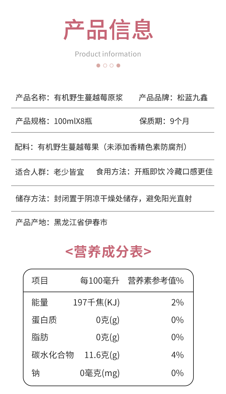 九鑫山珍 有机野生蔓越莓原浆 酸甜可口 健康美味 老少皆宜 纯净 天然 无污染