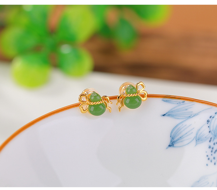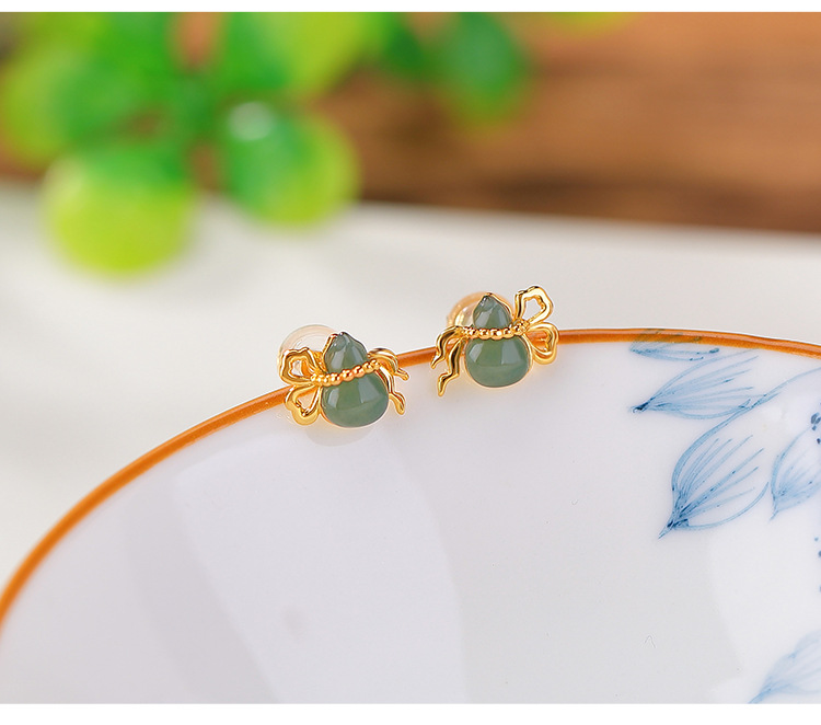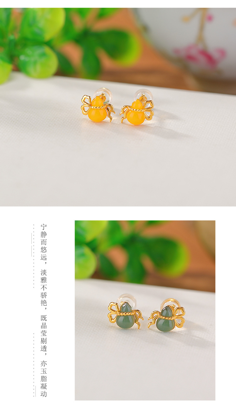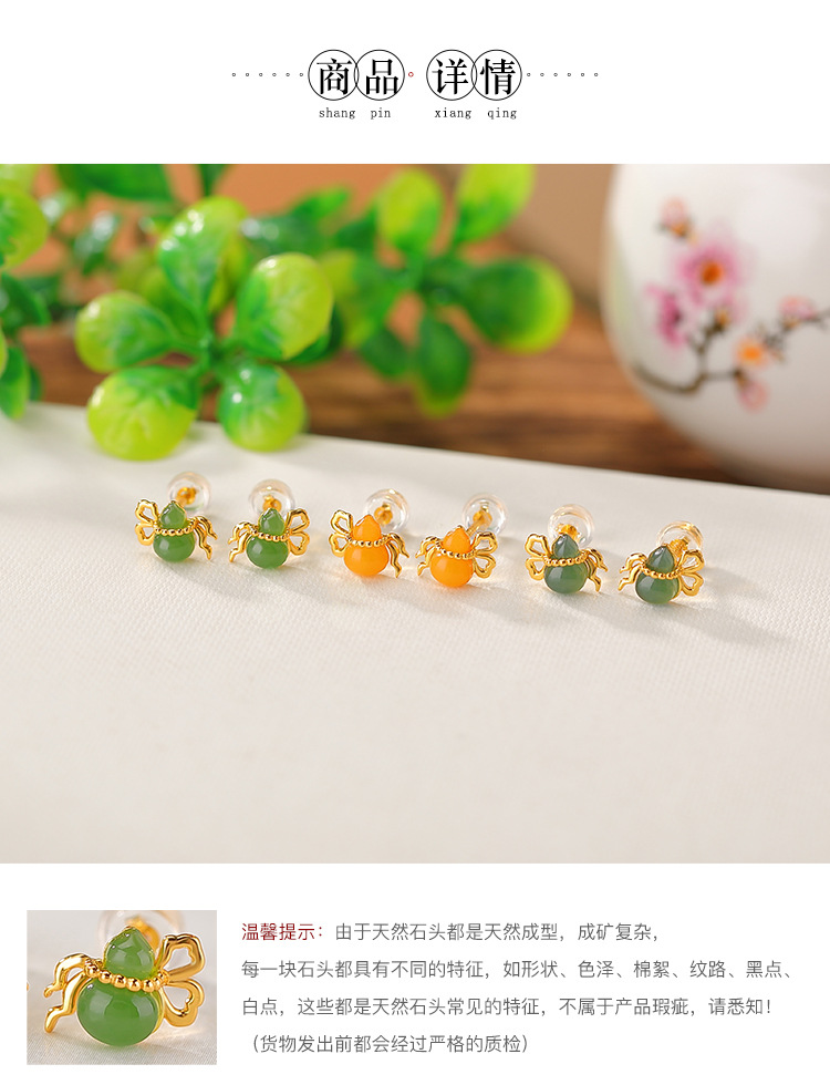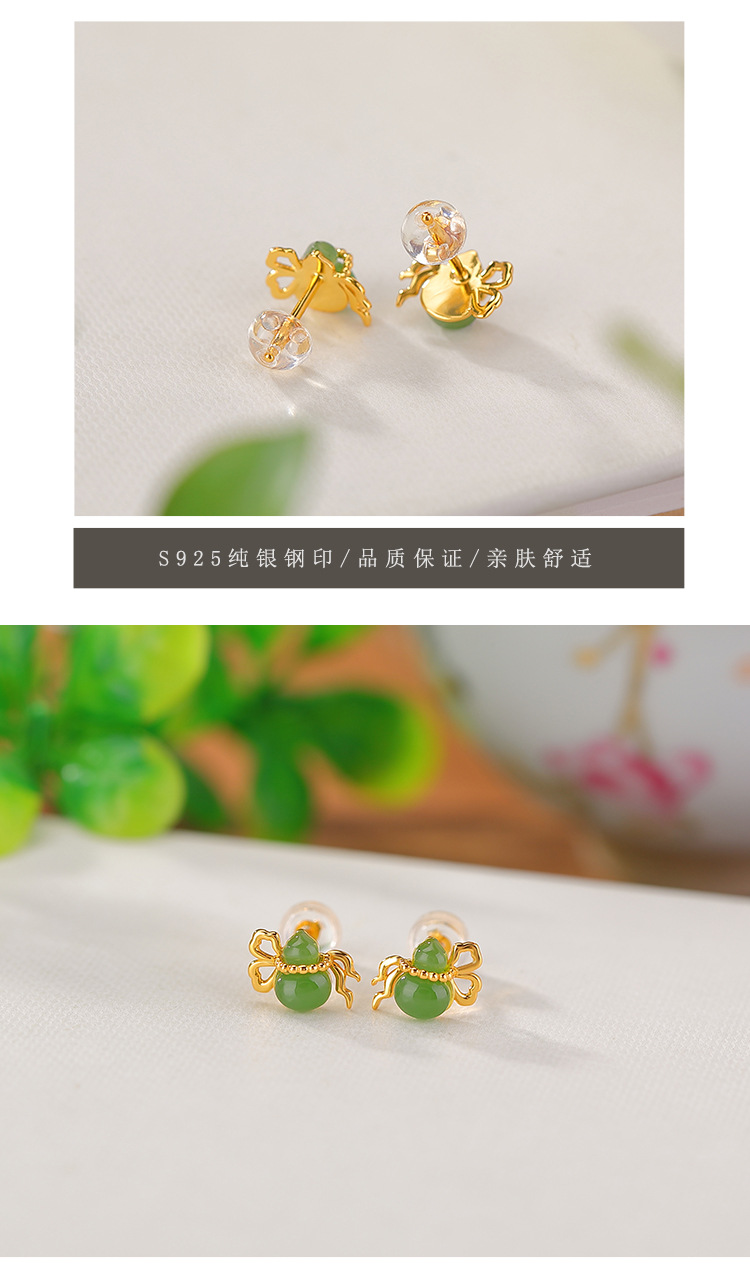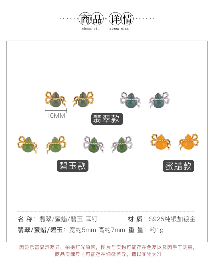 S925纯银镀金蓝水翡翠和田玉碧玉,蜜蜡蝴蝶结葫芦小巧银耳钉CW-ED03875