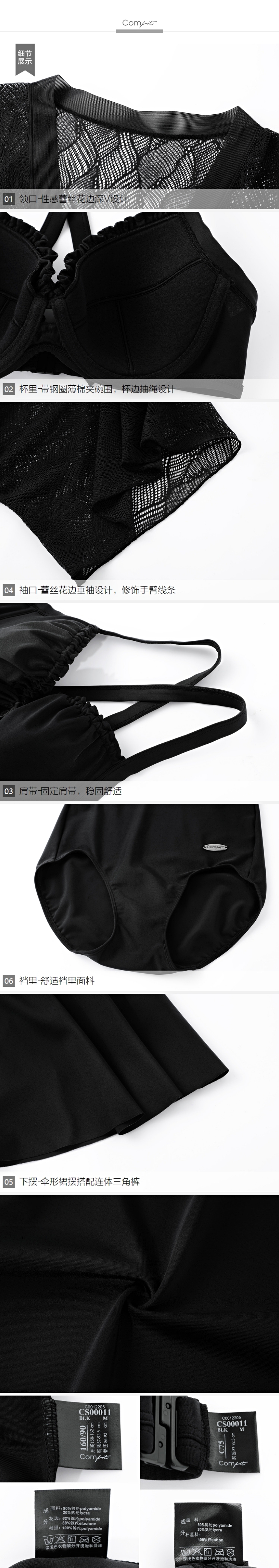 安莉芳comfit黑色蕾丝遮肉显瘦有钢圈薄杯裙式连体泳衣女CS00011