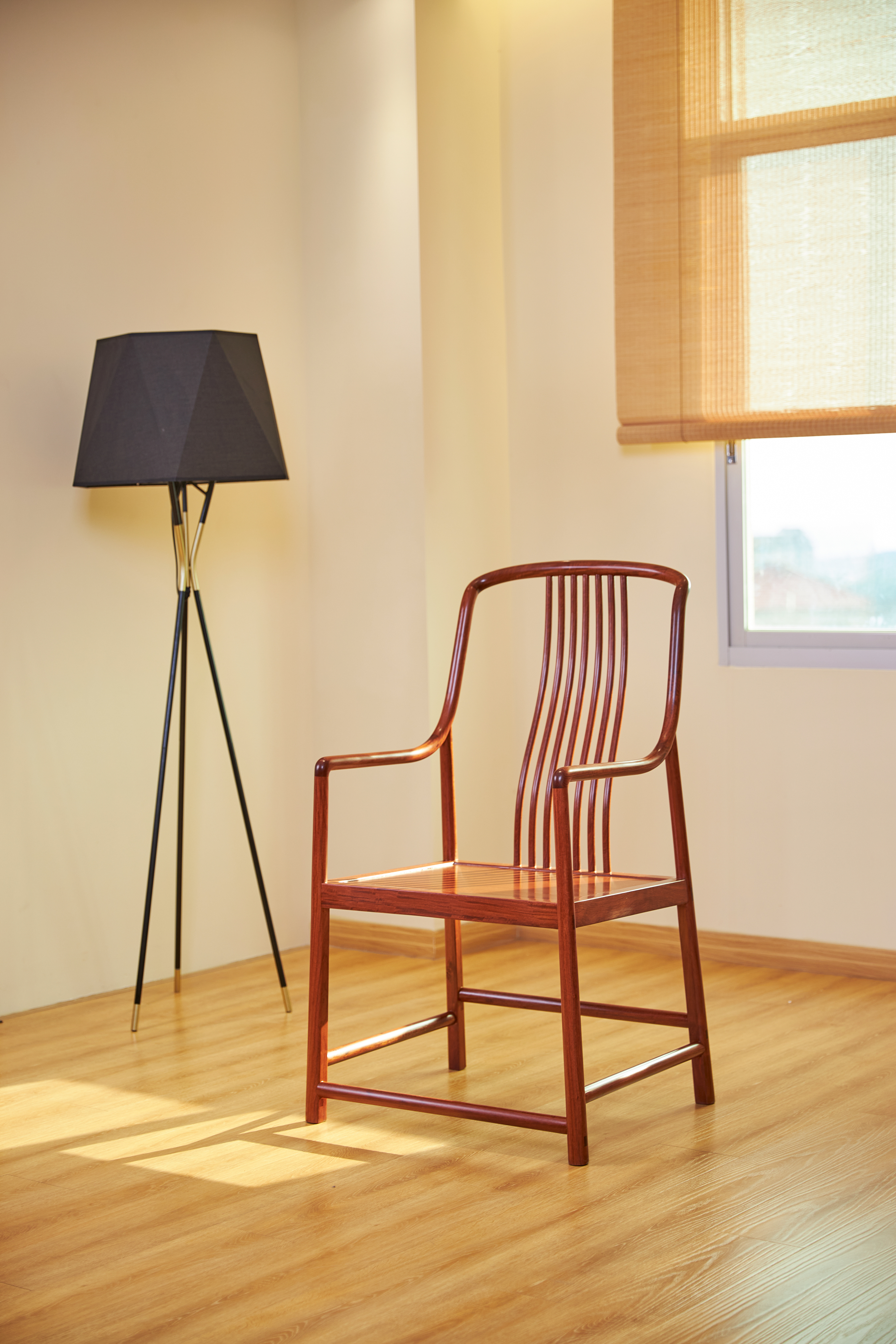 此扶手椅,风格疏朗通透,富现代气息。以缅甸花梨木制作,全器除座面为四面平的方材、腿足外圆里方外,通体框架采用圆材,整体方圆结合。三弯靠背采用曲棂式样,搭脑与扶手的线条柔婉,以烟袋锅榫结合。