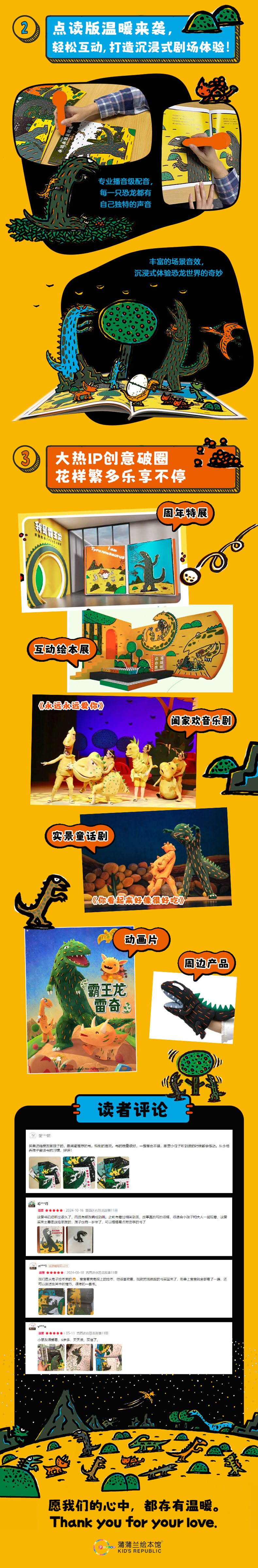 经典畅销绘本“宫西达也恐龙故事”系列再添新成员!全新的故事情节,更丰富的呈现方式,不变的是故事中永恒流淌着的爱与善良。《再见,很好吃》最温暖的久别重逢,跨域时空的挚爱深情!《你看起来好像很好吃》的续篇。二十年后,上了年纪的霸王龙被一只风神翼龙咬住了尾巴……紧急关头,一只甲龙带着两个甲龙宝宝救了霸王龙。霸王龙的身体渐渐恢复了,他教甲龙宝宝各种各样的本领,撞击、甩尾巴、吼叫……就在他们越来越熟悉时,一头凶狠的吉兰泰龙扑了过来……《永远永远是朋友》心灵比眼睛更能读懂友情的可贵霸王龙每一天都活得自私又任性,没有任何人爱他,他一个朋友也没有。一天,孤单的霸王龙和爪爪龙相遇了。爪爪龙的眼睛看不见,误把霸王龙认作了盔龙,一段奇妙的友谊就此展开。直到有一天,爪爪龙能看见了,终于发现一直陪伴着自己的竟然是霸王龙……《谢谢你来到我身边》爱能突破本能的界限,创造幸福的相守伤齿龙捡到了一颗恐龙蛋,但不论用什么方法......