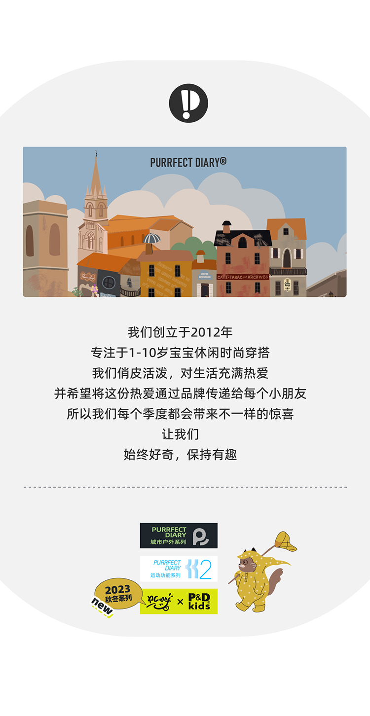 Purrfect-Diary专注于贴近自然随性的穿着概念,轻奢平价的童装文化传播,在产品设计上更加注重婴童穿着的舒适性、安全性、更出众的国际化品牌,将欧美的育婴文化在中国进行深入的传播与推广。