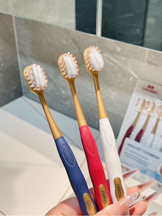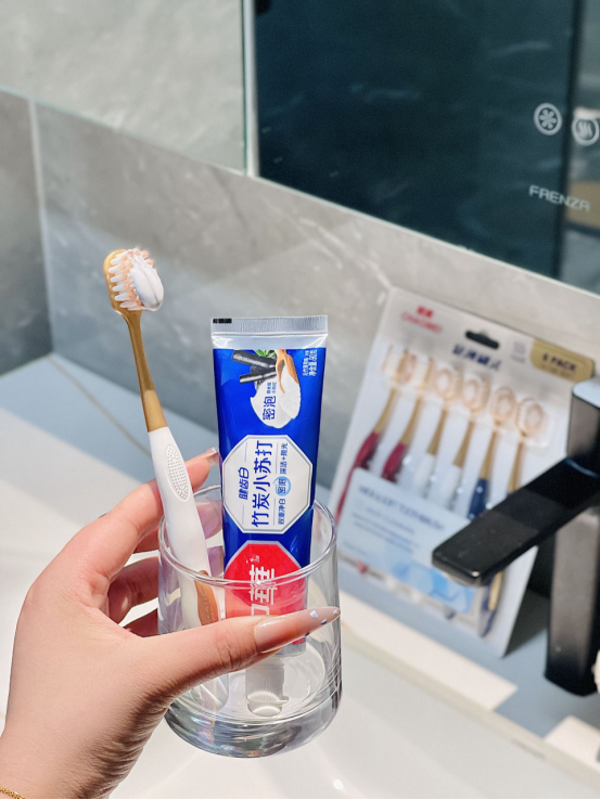 一进嘴就能感觉到它的厉害了 没有传统牙刷那种刷毛稀疏 感觉特别戳牙龈的那种傻愣感 没有一般软毛牙刷那种太软而没有力道的感觉 刷毛是那种自带Q弹的感觉 有一种用很duang的海绵垫在按摩的即视感 就很像在享受一场温柔而舒爽的口腔马杀鸡 是我在用其他牙刷的时候没有体会过的