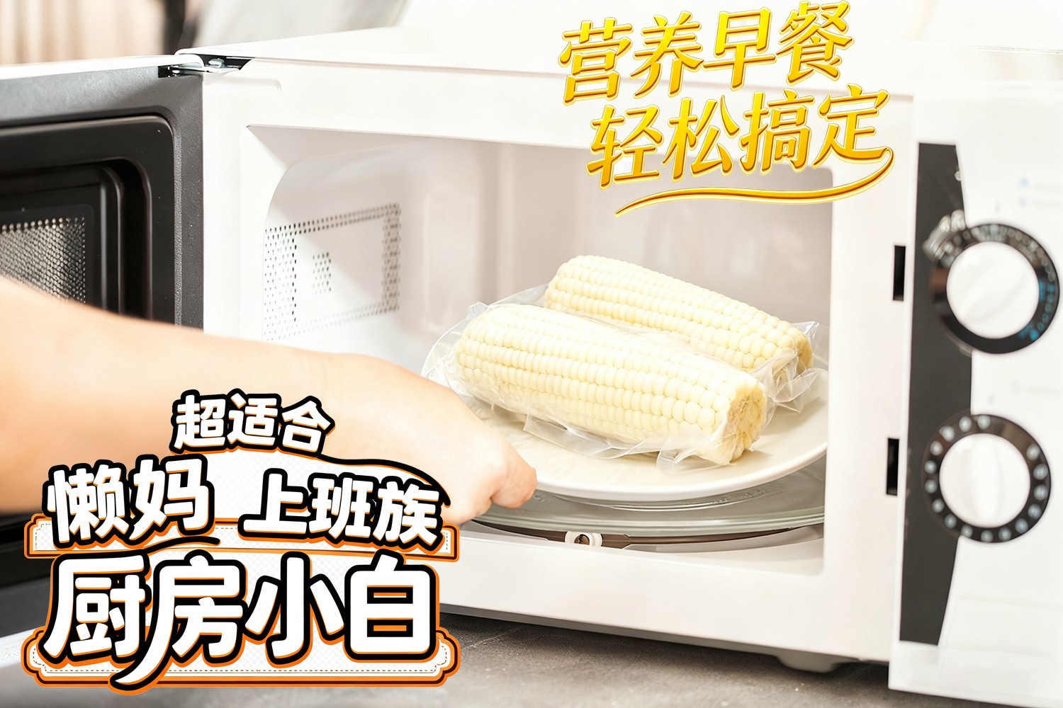 如果你有微波炉也可以撕个小口放进微波炉大火加热4-5分钟,简单方便,超适合懒妈、上班族和厨房小白、早上时间紧张,叮一根玉米,搭配牛奶和水果一顿营养早餐就搞定了
