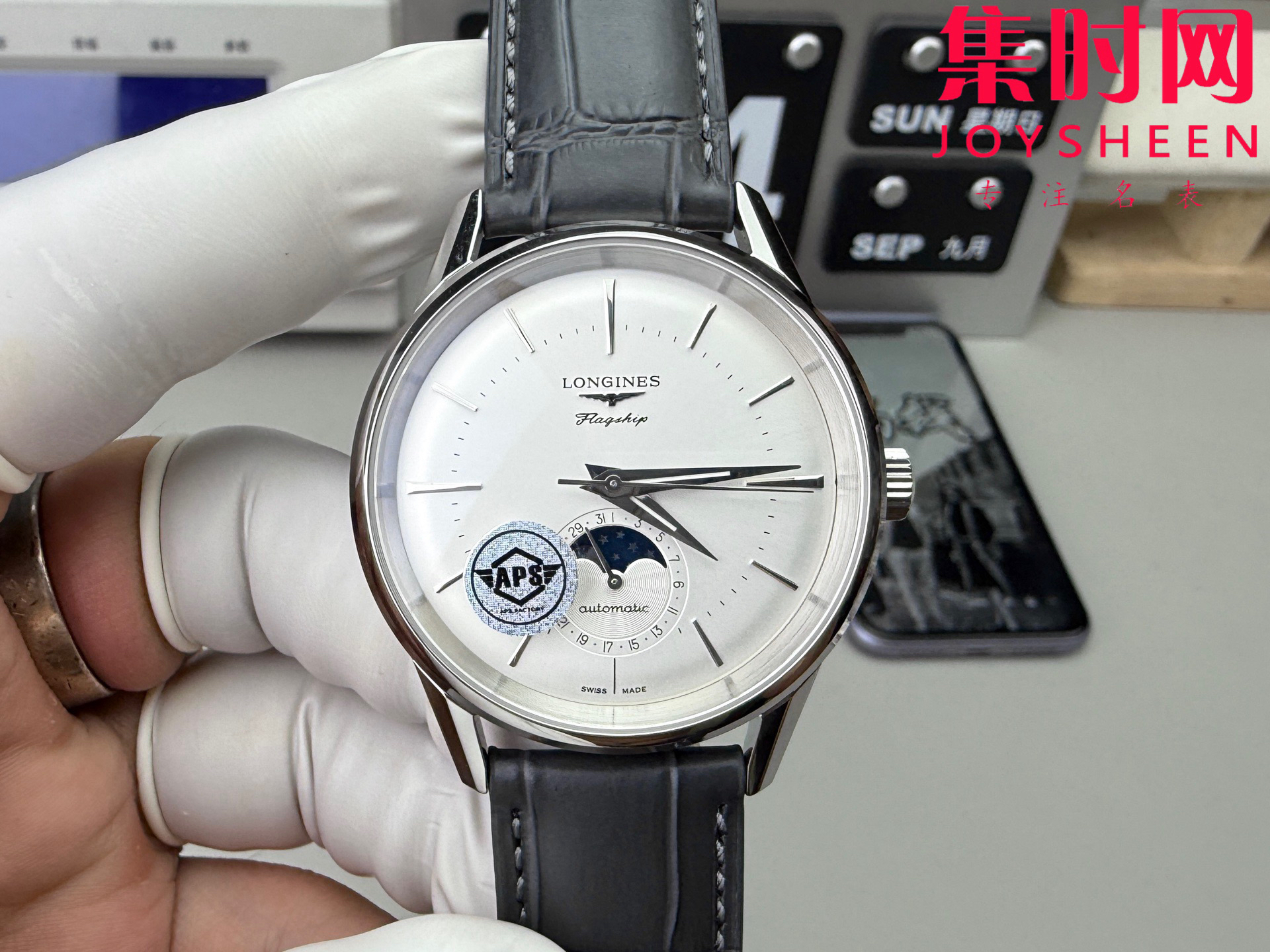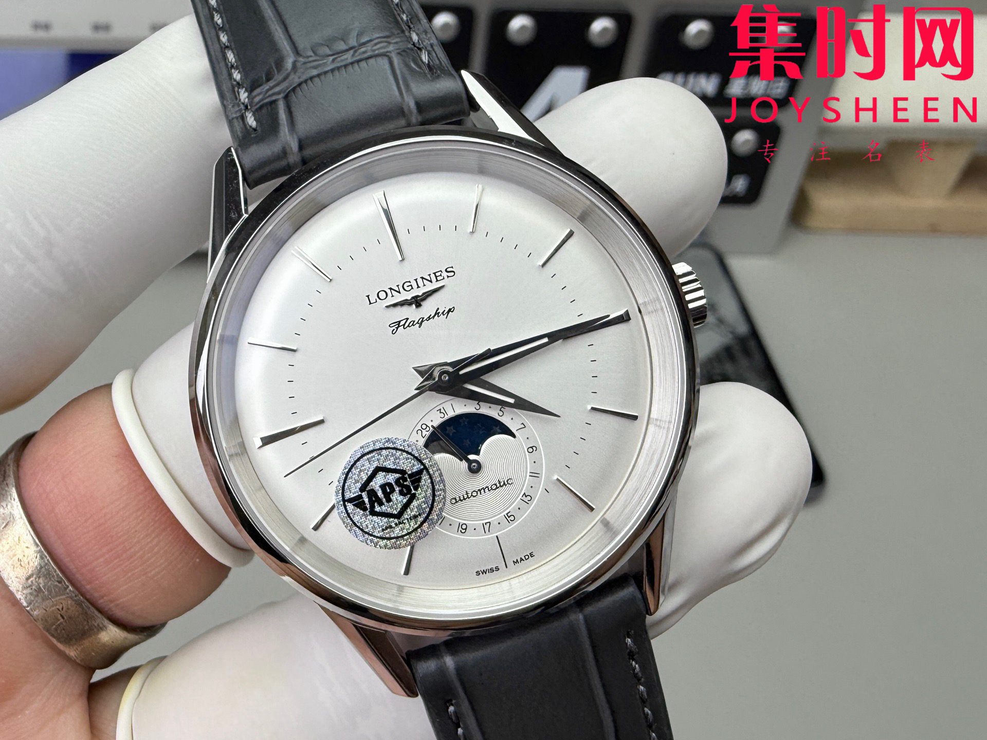 新品APS浪琴军旗月相系列 复古军旗 男士腕表 表径38.5mm 来自浪琴表全新推出的经典系列军旗腕表,配备月相功能。军旗系列腕表时浪琴表在上世纪50年代推出的正装表款,以优雅简洁的风格备受表友喜爱,是品牌的标志性系列之一。这款腕表的设计灵感来源于品牌1975年推出的古董表款,所以我们可以看到,不管是38.5毫米的表径、特殊弧面造型的表盘、12点钟品牌标识下方的花体“Flagship”,以及旋转表背上的帆船浮雕标识,都让这款腕表充满复古风格。全新月相功能的融入让这款腕表的优雅气质更上一层,日期显示环绕在月相盘面外圈,既增加实用性,又不会破坏盘面的整体性。腕表内部搭载的是定制L899.5自动上链一体机械机芯