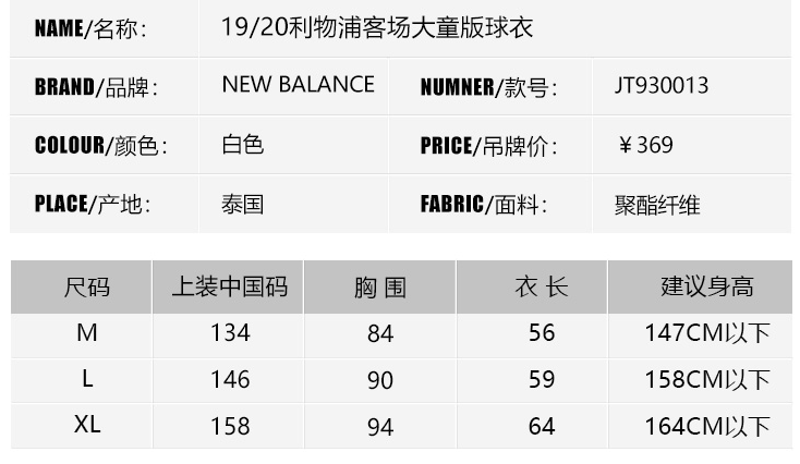 SFS NB正版19-20利物浦主场球衣 儿童版短袖足球服JT930000