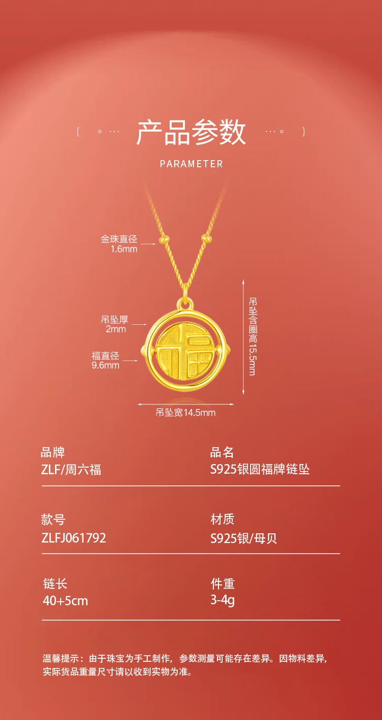 周六福S925银圆福牌项链ZLFJ061792★