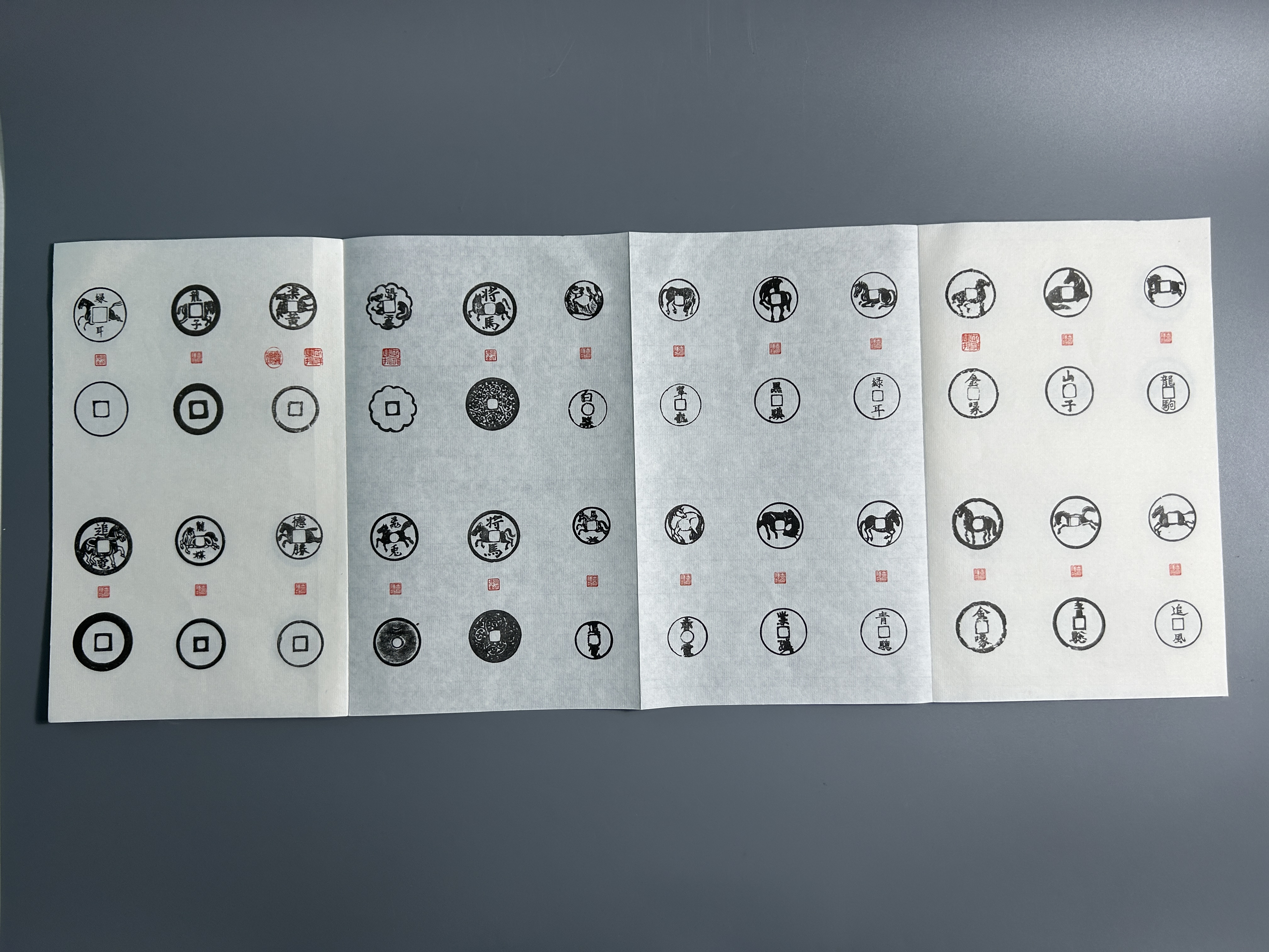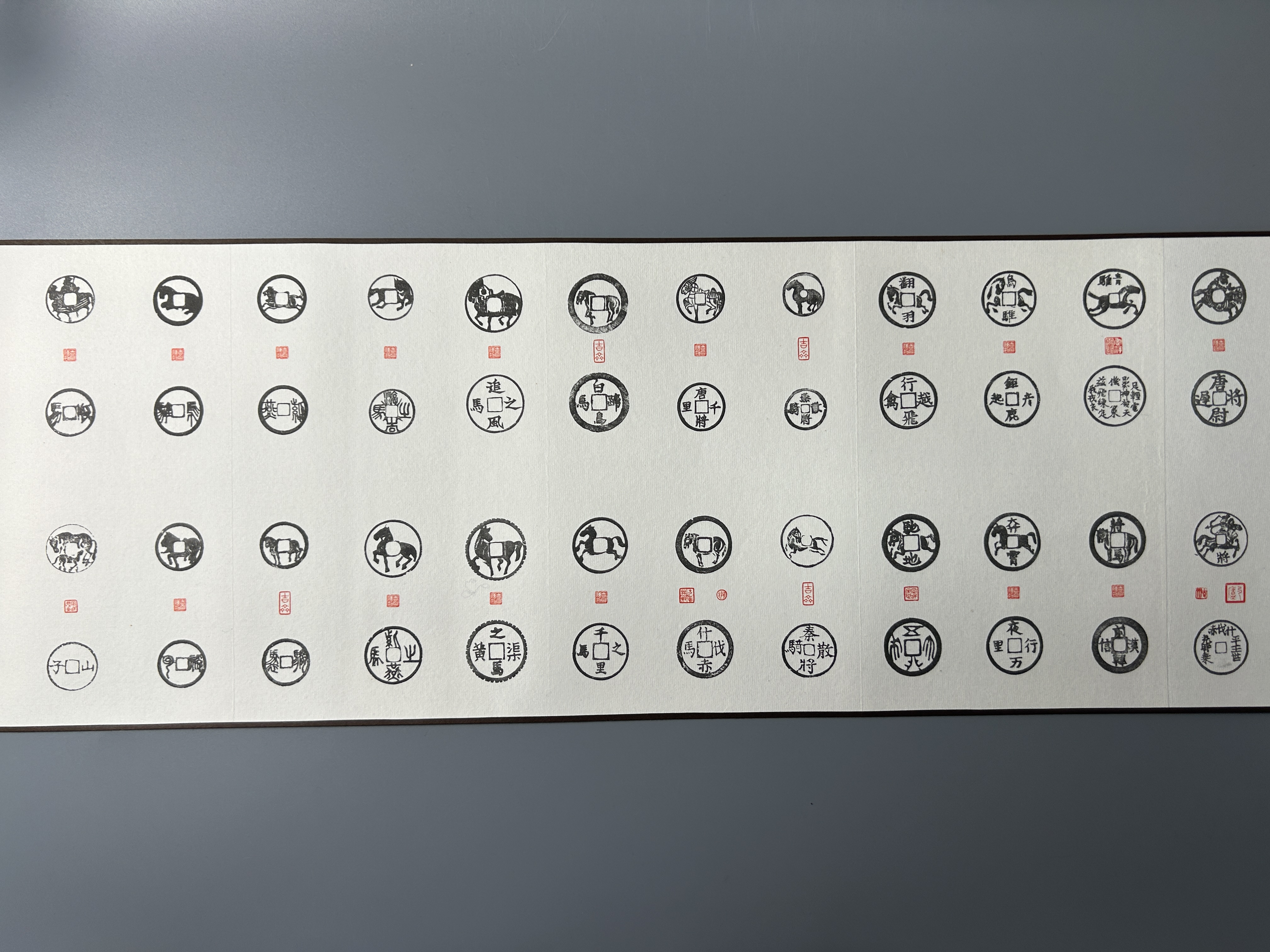 马钱,亦称“打马格钱”是中国古代压胜钱的重要组成部分,其面文多以历史名将为文,背面则铸有形态各异的马形图案。据说这种“打马格钱”始于宋代,作为博弈戏玩之物。北宋著名女词人李清照《打马图经》书中曾详细地介绍了这种游戏的规则,并称之为“博弈之上流,闺中之雅戏”。上世纪90年代末钱币大师马定祥与其次子马传德共同编纂《百骏泉图》,甄选历代珍稀马钱百品。虽已成手稿,但未正式发行。三十年后,重编马氏万拓楼丛书,《打马泉图》付梓之际,特制宣纸“百骏泉图”拓片超长手卷,并配以朱印。卷名采用马师的题字,卷末有马传德先生撰写的后记。“時逢盛世,為再續馬氏萬拓樓叢書,今日特製家父遺稿《百駿泉圖》手卷千份,以飨同好。我們馬氏父子皆是龍年出生,故祝諸君年年龍馬精神,神龍馬壯!” 手卷长3.2米,蔚为壮观。这幅马老亲选马钱拓图,是中国历代马钱的集大成者,通过高清宣纸影印复现了马老原作的笔墨精神,限量1000张,编号发行。适宜家居、办公场所装饰使用,也是馈赠亲朋、礼尚往来之佳品!2026年丙午马年是钱币大师马定祥先生诞辰110周年,也是迎接新年的馈赠或点缀家具之上品。适宜悬挂家居室、办公场所、古玩店铺,也是馈赠亲朋、往来之美的好礼!
