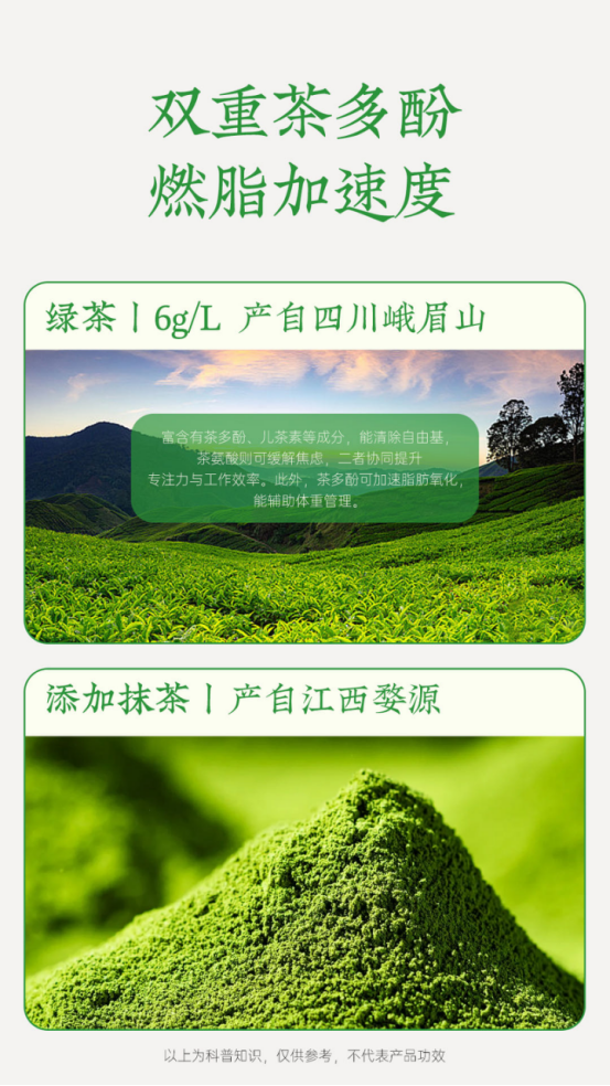 减减期姐妹的私藏宝藏好茶饮 喝❶瓶脂肪对策生茶≈喝下两杯高山绿茶+一杯抹茶!茶源好!茶才好! ✅⛰峨眉高山云雾绿茶 海拔1200米以上高山茶园,云雾缭绕每年只采清明前头茬嫩芽🌱茶叶嫩绿油润,芽叶柔嫩,清香馥郁 ✅⛰中国蕞美乡村·婺源抹茶 色泽翠绿,滋味鲜醇,香气清新~ 中国绿茶金三角核心产区♻ 石磨工艺,细度800目以上 抹茶含大量纤维素,让咱们的肚肚动起来