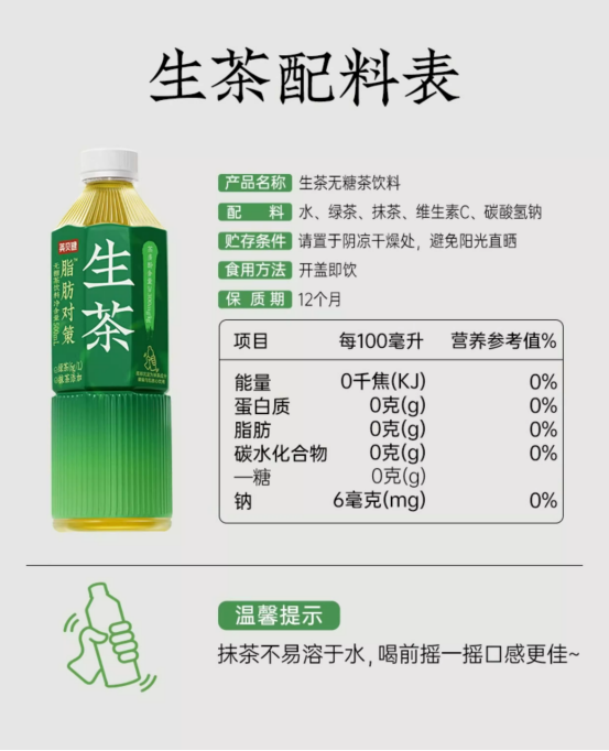配料表:水、绿茶、抹茶、维C、碳酸氢钠! 0糖0脂0卡 的配方 太干净了 无负担畅饮 喝生茶,充分享受茶叶本身的“鲜” 丰富的香气,一口惊艳,我真的爱惨辽