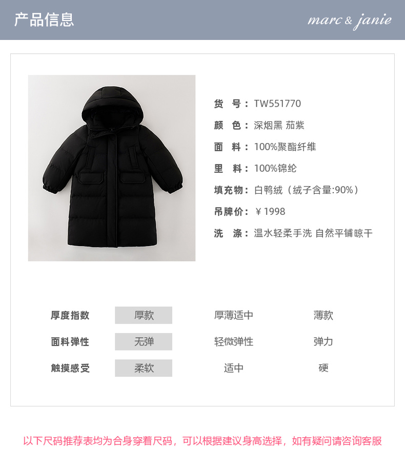 【无氟防泼水】马克珍妮女童防风抗寒加厚加长款羽绒服2025年冬装新款551770