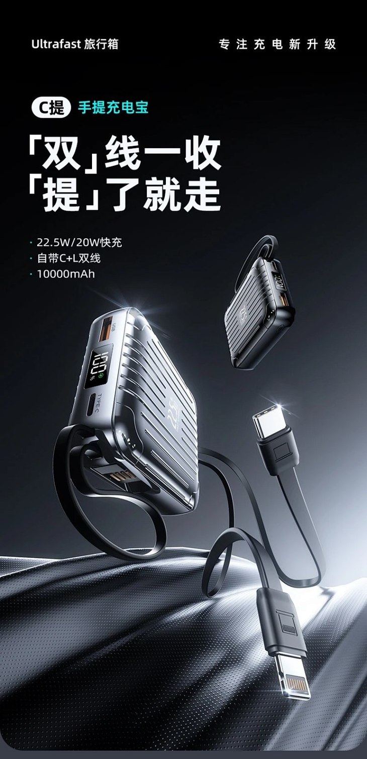 ✅自带Type-C+Lightning+usb三线,外出无需再带其它充电线