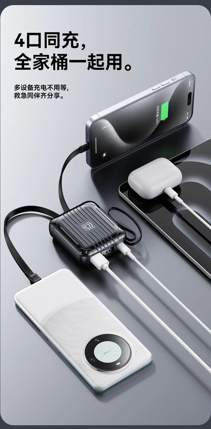 同时可充4台设备【出口欧美PINICK品柠·快充mini小银砖升级款2.0】10000mAh大容量,高至22.5W超级快充,升级Type-c+苹果双+USB三线-WD