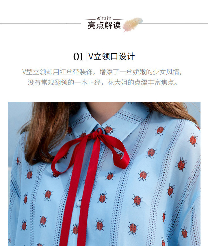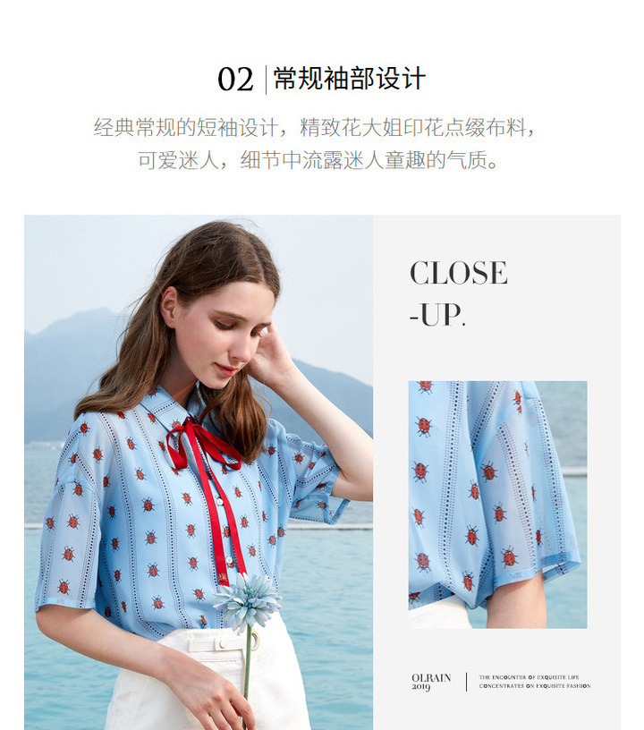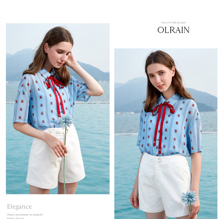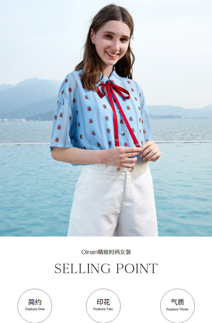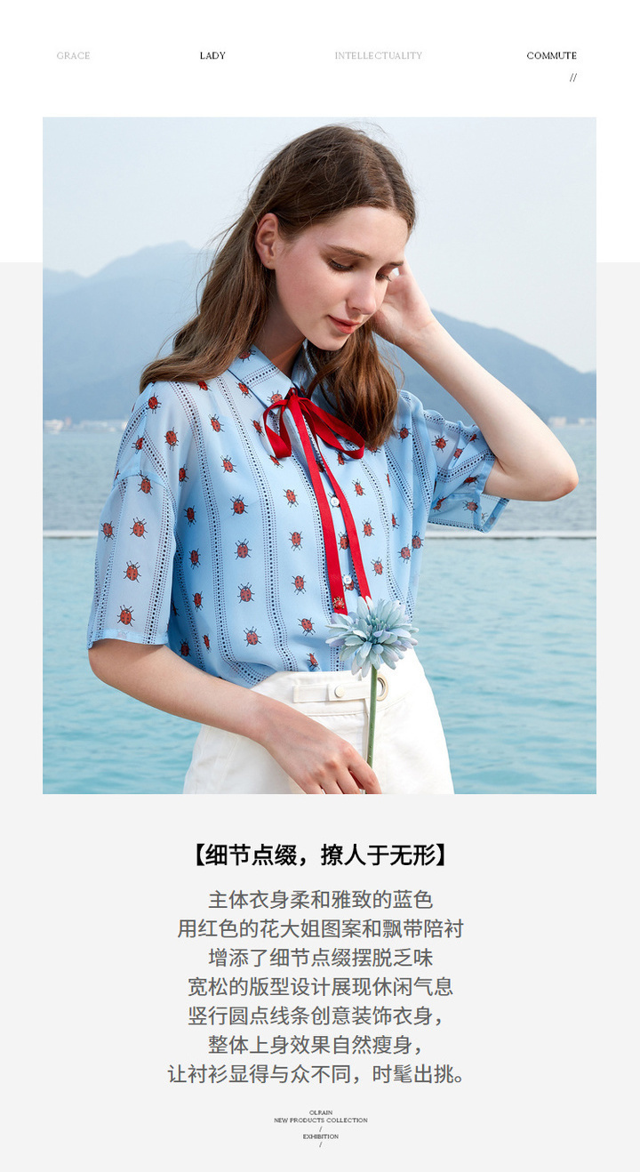 OLrain法式高级穿搭波点领衬衫女夏季2022宽松蝴蝶结撞色衬衣