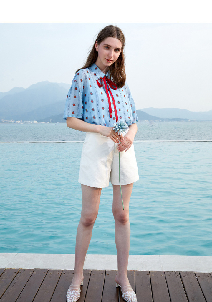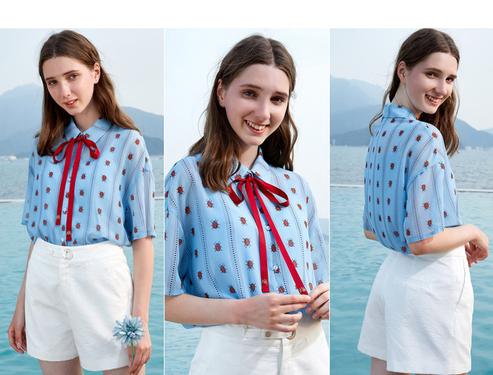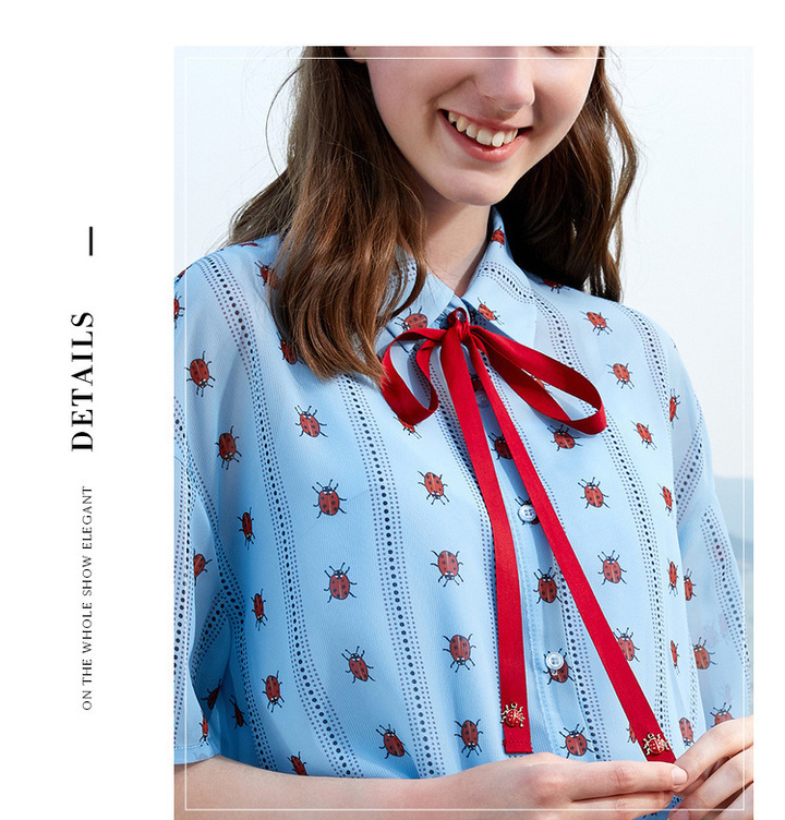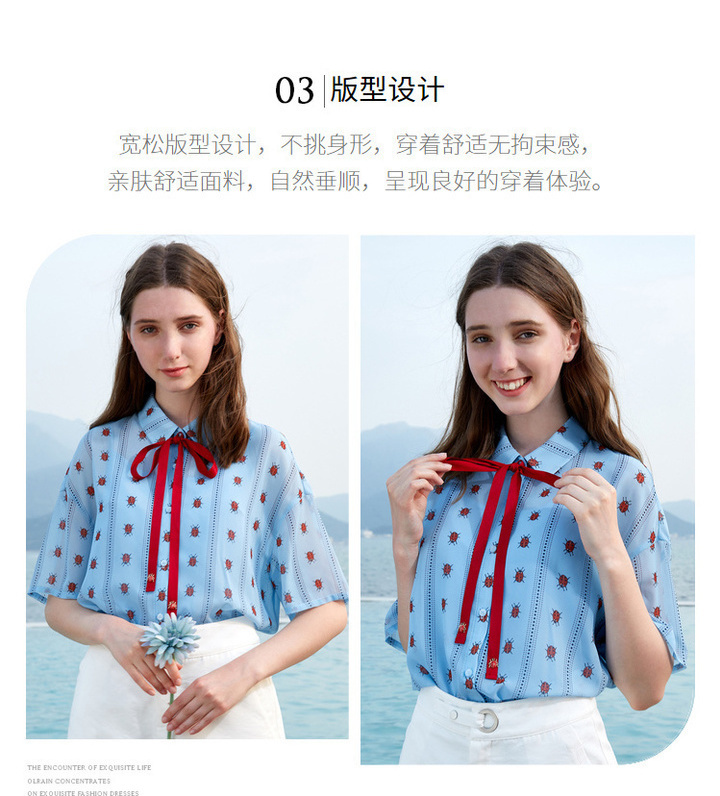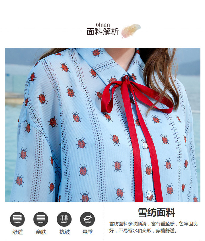 OLrain法式高级穿搭波点领衬衫女夏季2022宽松蝴蝶结撞色衬衣