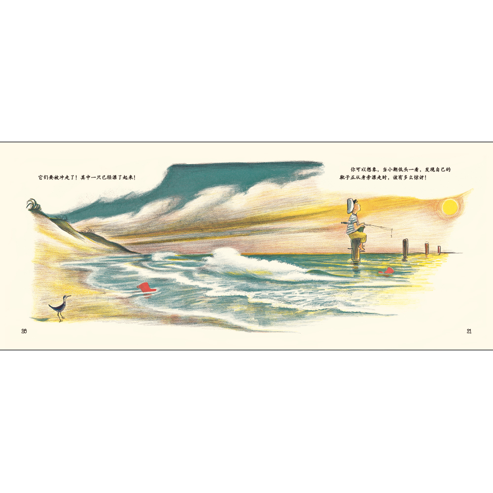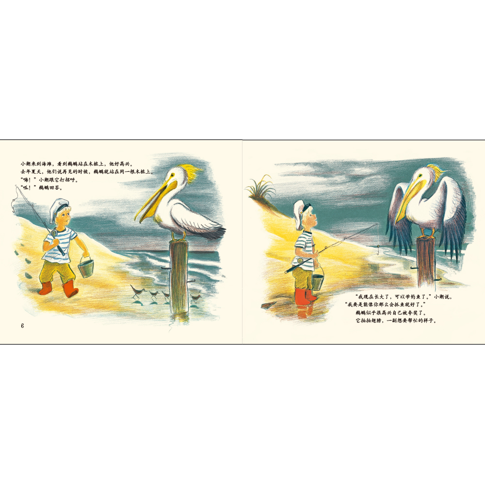 每年夏天,小潮和家人都会来到海边度假。这个午后,他穿上新防水靴,拿上钓竿和沙桶来到沙滩,看见鹈鹕还站在那根木桩上,就像去年夏天一样……